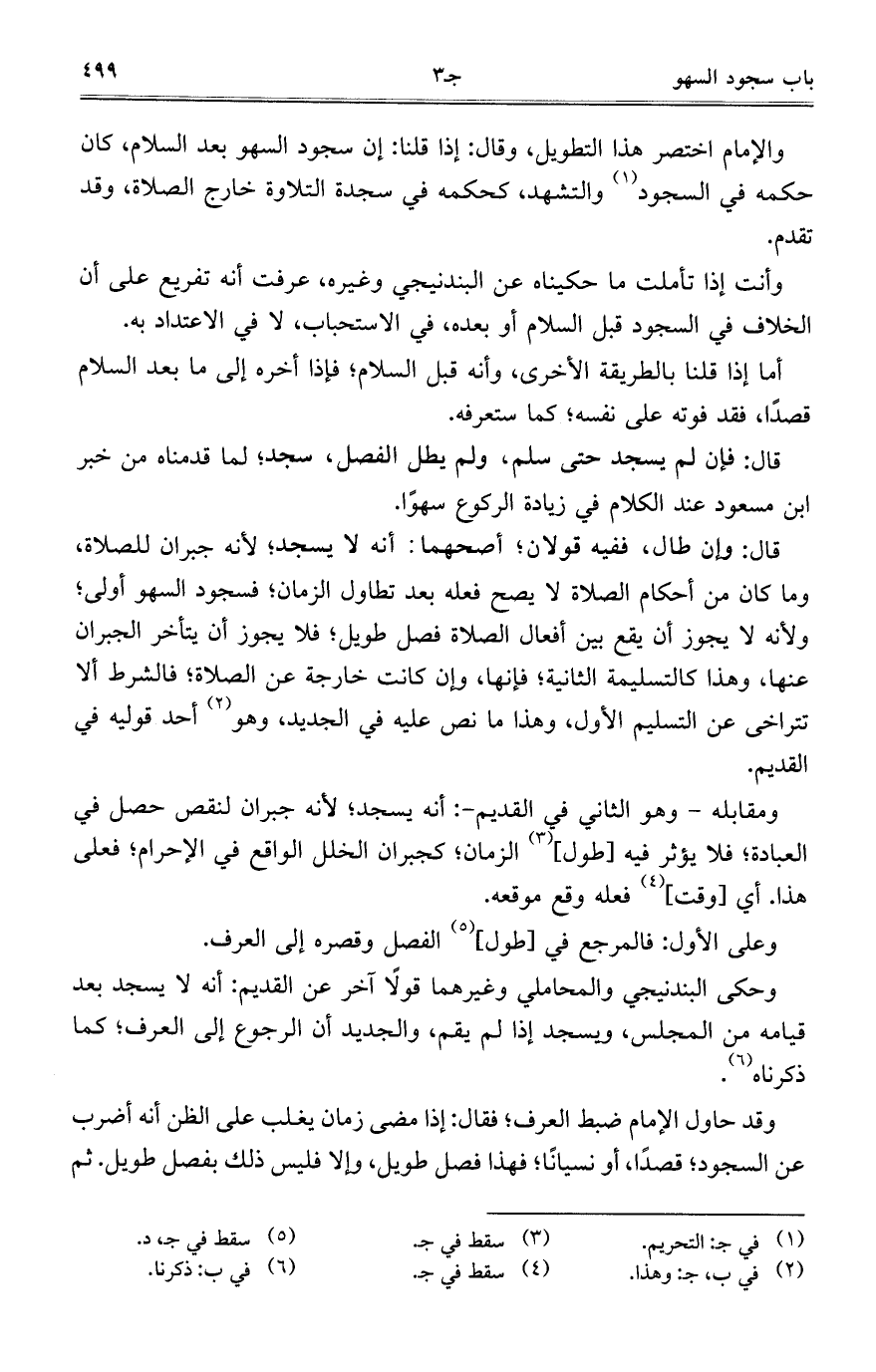 والإمام اختصر هذا التطويل، وقال: إذا قلنا: إن سجود السهو بعد السلام، كان حكمه في السجود والتشهد، كحكمه في سجدة التلاوة خارج الصلاة، وقد تقدم.