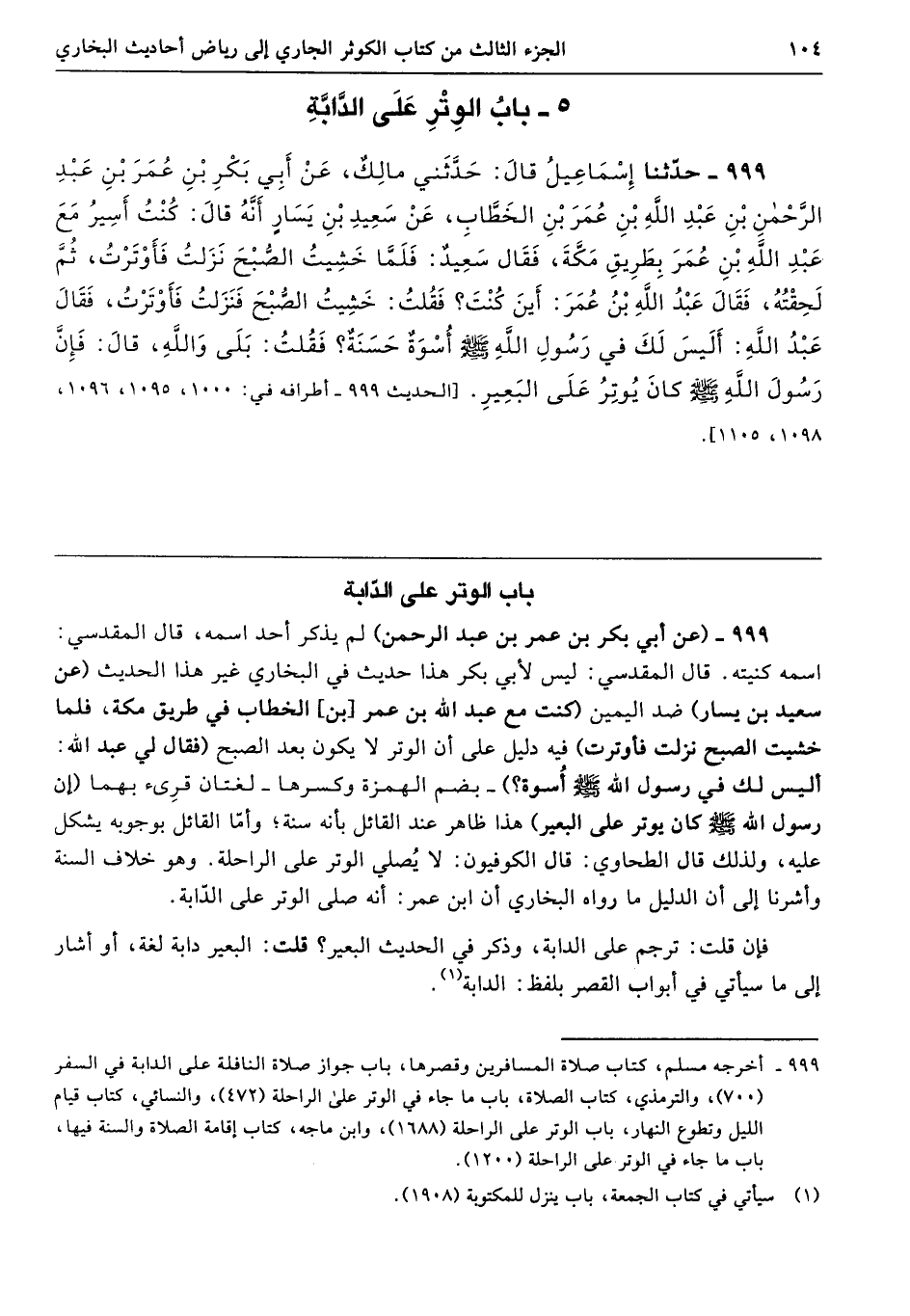 999 - (عن أبي بكر بن عمر بن عبد الرحمن) لم يذكر أحد اسمه، قال المقدسي: اسمه كنيته. قال المقدسي: ليس لأبي بكر هذا حديث في البخاري غير هذا الحديث (عن سعيد بن يسار) ضد اليمين (كنت مع عبد الله بن عمر [بن] الخطاب في طريق مكة، فلما خشبت الصبح نزلت فأوترت) فيه دليل على أن الوتر لا يكون بعد الصبح (فقال لي عبد الله: أليس لك في رسول الله - صلى الله عليه وسلم - أُسوة؟) -بضم الهمزة وكسرها- لغتان قرِئ بهما (إن رسول الله - صلى الله عليه وسلم - كان يوتر على البعير) هذا ظاهر عند القائل بأنه سنة؛ وأمّا القائل بوجوبه يشكل عليه، ولذلك قال الطحاوي: قال الكوفيون: لا يُصلي الوتر على الراحلة. وهو خلاف السنة وأشرنا إلى أن الدليل ما رواه البخاري أن ابن عمر: أنه صلى الوتر على الدّابة.