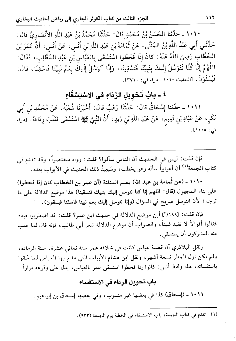1010 - (عن ثُمامة بن عبد الله) بضم المثلثة (أن عمر بن الخطاب كان إذا قحطوا) على بناء المجهول (قال: اللهم إنا كنا نتوسل إليك بنبيك فتسقينا) هذا موضع الدلالة على ما ترجم؛ لأن التوسل صريح في السؤال (وإنا نتوسل إليك بعم نبينا فاسقنا فيسقون).