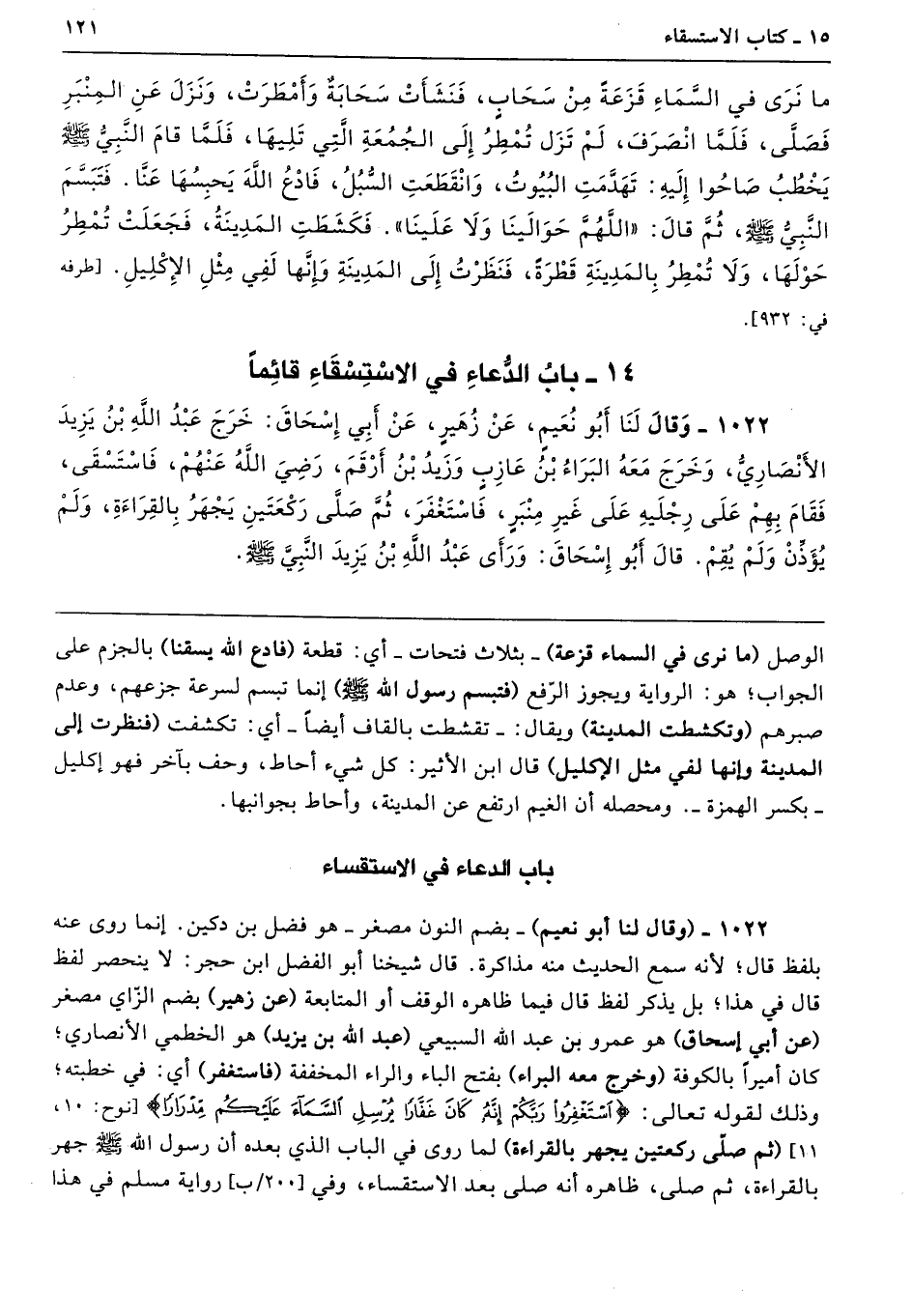 1022 - (وقال لنا أبو نعيم) -بضم النون مصغر- هو فضل بن دكين. إنما روى عنه بلفظ قال؛ لأنه سمع الحديث منه مذاكرة. قال شيخنا أبو الفضل ابن حجر: لا ينحصر لفظ قال في هذا؛ بل يذكر لفظ قال فيما ظاهره الوقف أو المتابعة (عن زهير) بضم الزّاي مصغر (عن أبي إسحاق) هو عمرو بن عبد الله السبيعي (عبد الله بن يزيد) هو الخطمي الأنصاري؛ كان أميرًا بالكوفة (وخرج معه البراء) بفتح الباء والراء المخففة (فاستغفر) أي: في خطبته؛ وذلك لقوله تعالى: {اسْتَغْفِرُوا رَبَّكُمْ إِنَّهُ كَانَ غَفَّارًا (10) يُرْسِلِ السَّمَاءَ عَلَيْكُمْ مِدْرَارًا} [نوح: 10، 11] ثم صلّى ركعتين يجهر بالقراءة) لما روى في الباب الذي بعده أن رسول الله - صلى الله عليه وسلم - جهر بالقراءة، ثم صلى، ظاهره أنه صلى بعد الاستقساء، وفي رواية مسلم في هذا