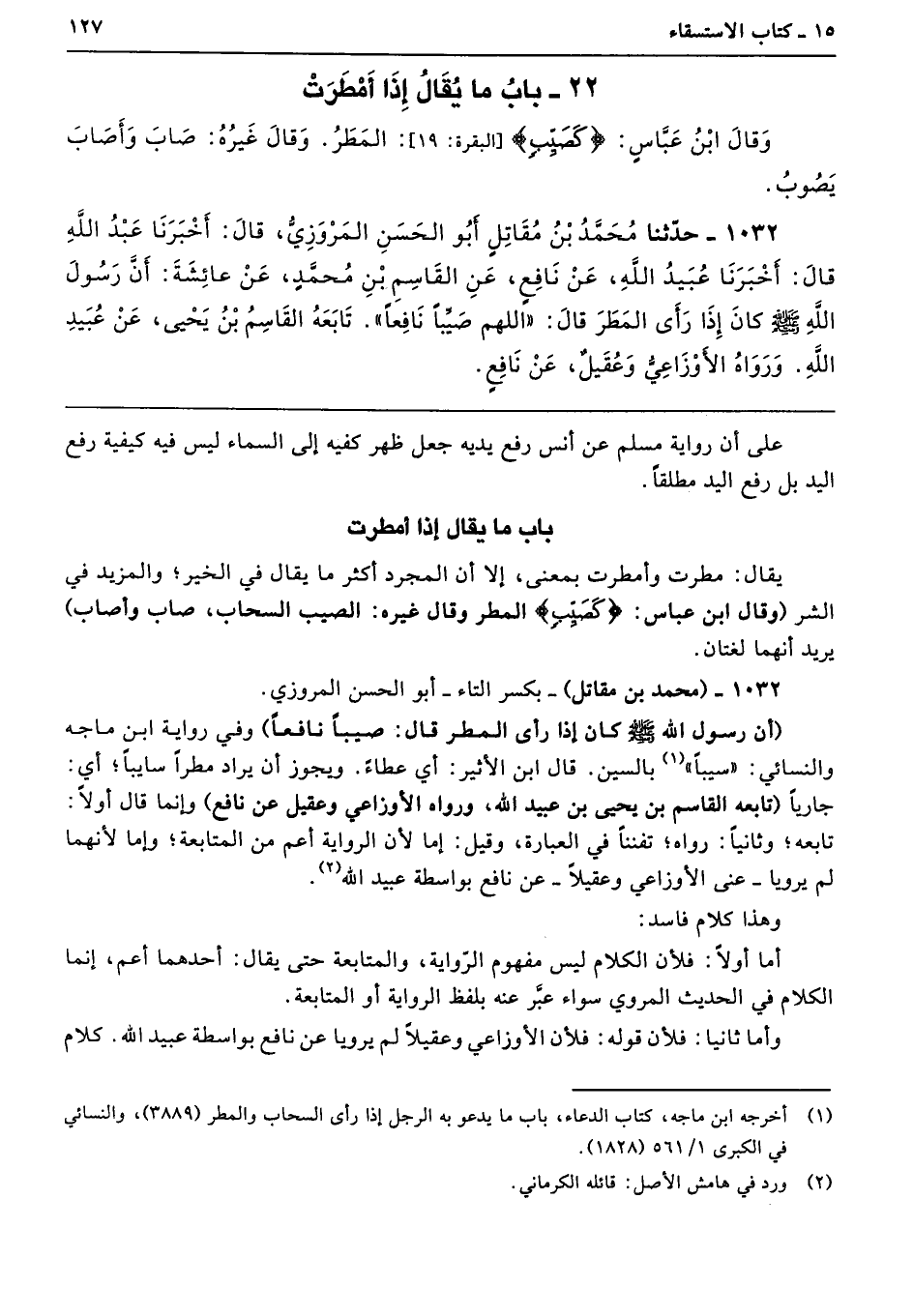 1032 - حَدَّثَنَا مُحَمَّدٌ - هُوَ ابْنُ مُقَاتِلٍ أَبُو الْحَسَنِ الْمَرْوَزِىُّ - قَالَ أَخْبَرَنَا عَبْدُ اللَّهِ قَالَ أَخْبَرَنَا عُبَيْدُ اللَّهِ عَنْ نَافِعٍ عَنِ الْقَاسِمِ بْنِ مُحَمَّدٍ عَنْ عَائِشَةَ أَنَّ رَسُولَ اللَّهِ - صلى الله عليه وسلم - كَانَ إِذَا رَأَى الْمَطَرَ قَالَ «صَيِّبًا نَافِعًا». تَابَعَهُ الْقَاسِمُ بْنُ يَحْيَى عَنْ عُبَيْدِ اللَّهِ. وَرَوَاهُ الأَوْزَاعِىُّ وَعُقَيْلٌ عَنْ نَافِعٍ.