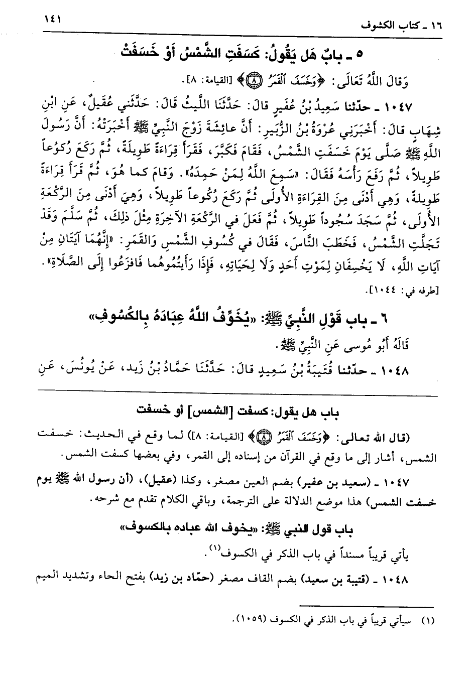 1047 - (سعيد بن عفير) بضم العين مصغر، وكذا (عقيل)، (أن رسول الله - صلى الله عليه وسلم - يوم خسفت الشمس) هذا موضع الدلالة على الترجمة، وباقي الكلام تقدم مع شرحه.