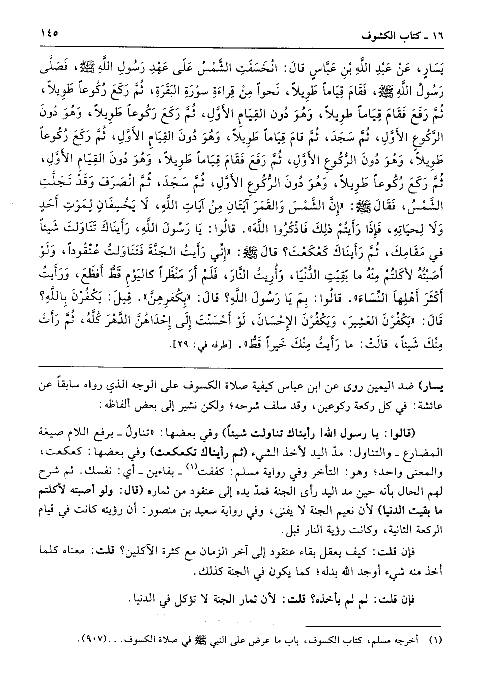 يَسَارٍ عَنْ عَبْدِ اللَّهِ بْنِ عَبَّاسٍ قَالَ انْخَسَفَتِ الشَّمْسُ عَلَى عَهْدِ رَسُولِ اللَّهِ - صلى الله عليه وسلم -، فَصَلَّى رَسُولُ اللَّهِ - صلى الله عليه وسلم -، فَقَامَ قِيَامًا طَوِيلاً نَحْوًا مِنْ قِرَاءَةِ سُورَةِ الْبَقَرَةِ، ثُمَّ رَكَعَ رُكُوعًا طَوِيلاً، ثُمَّ رَفَعَ فَقَامَ قِيَامًا طَوِيلاً، وَهْوَ دُونَ الْقِيَامِ الأَوَّلِ، ثُمَّ رَكَعَ رُكُوعًا طَوِيلاً، وَهْوَ دُونَ الرُّكُوعِ الأَوَّلِ، ثُمَّ سَجَدَ، ثُمَّ قَامَ قِيَامًا طَوِيلاً وَهْوَ دُونَ الْقِيَامِ الأَوَّلِ، ثُمَّ رَكَعَ رُكُوعًا طَوِيلاً، وَهْوَ دُونَ الرُّكُوعِ الأَوَّلِ، ثُمَّ رَفَعَ فَقَامَ قِيَامًا طَوِيلاً، وَهْوَ دُونَ الْقِيَامِ الأَوَّلِ، ثُمَّ رَكَعَ رُكُوعًا طَوِيلاً، وَهْوَ دُونَ الرُّكُوعِ الأَوَّلِ، ثُمَّ سَجَدَ، ثُمَّ انْصَرَفَ وَقَدْ تَجَلَّتِ الشَّمْسُ، فَقَالَ - صلى الله عليه وسلم - «إِنَّ الشَّمْسَ وَالْقَمَرَ آيَتَانِ مِنْ آيَاتِ اللَّهِ، لاَ يَخْسِفَانِ لِمَوْتِ أَحَدٍ وَلاَ لِحَيَاتِهِ، فَإِذَا رَأَيْتُمْ ذَلِكَ فَاذْكُرُوا اللَّهَ». قَالُوا يَا رَسُولَ اللَّهِ، رَأَيْنَاكَ تَنَاوَلْتَ شَيْئًا فِي مَقَامِكَ، ثُمَّ رَأَيْنَاكَ كَعْكَعْتَ. قَالَ - صلى الله عليه وسلم - «إِنِّى رَأَيْتُ الْجَنَّةَ، فَتَنَاوَلْتُ عُنْقُودًا، وَلَوْ أَصَبْتُهُ لأَكَلْتُمْ مِنْهُ مَا بَقِيَتِ الدُّنْيَا، وَأُرِيتُ النَّارَ، فَلَمْ أَرَ مَنْظَرًا كَالْيَوْمِ قَطُّ أَفْظَعَ، وَرَأَيْتُ أَكْثَرَ أَهْلِهَا النِّسَاءَ». قَالُوا بِمَ يَا رَسُولَ اللَّهِ قَالَ «بِكُفْرِهِنَّ». قِيلَ يَكْفُرْنَ بِاللَّهِ قَالَ «يَكْفُرْنَ الْعَشِيرَ، وَيَكْفُرْنَ الإِحْسَانَ، لَوْ أَحْسَنْتَ إِلَى إِحْدَاهُنَّ الدَّهْرَ كُلَّهُ، ثُمَّ رَأَتْ مِنْكَ شَيْئًا قَالَتْ مَا رَأَيْتُ مِنْكَ خَيْرًا قَطُّ». طرفه 29