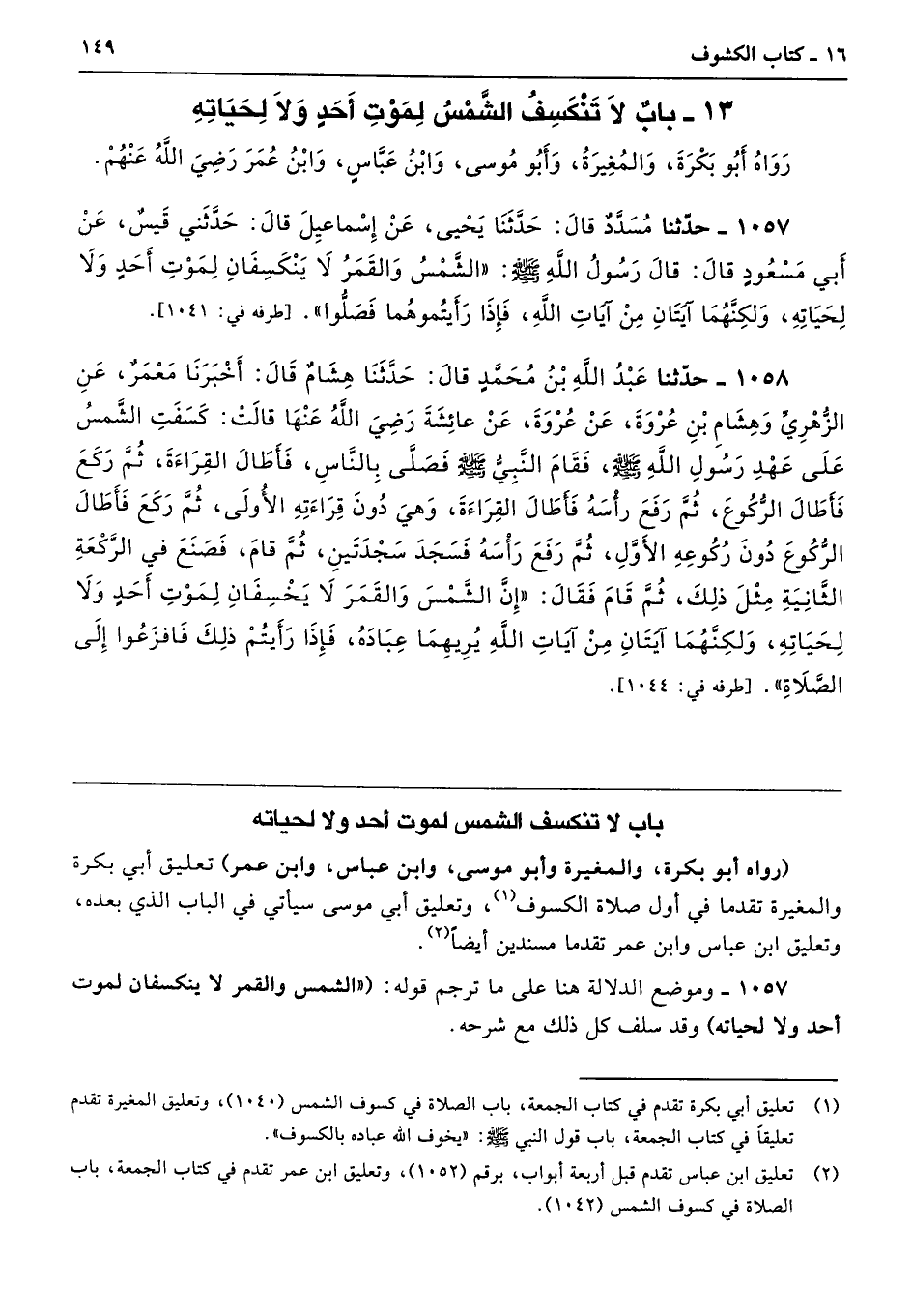 1057 - وموضع الدلالة هنا على ما ترجم قوله: ("الشمس والقمر لا ينكسفان لموت أحد ولا لحياته) وقد سلف كل ذلك مع شرحه.