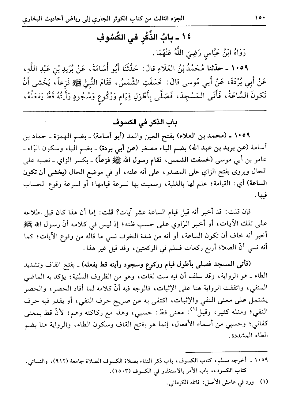 1059 - (محمَّد بن العلاء) بفتح العين والمد (أبو أسامة) -بضم الهمزة- حماد بن أسامة (عن بريد بن عبد الله) بضم الباء مصغر (عن أبي بردة) -بضم الباء وسكون الرّاء- عامر بن أبي موسى (خسفت الشمس، فقام رسول الله - صلى الله عليه وسلم - فزعًا) -بكسر الزاي- نصبه على الحال ويروى بفتح الزاي على المصدر، على أنه علته، أو في موضع الحال (يخشى أن تكون الساعة) أي: القيامة؛ علم لها بالغلبة، وسميت بها لسرعة قيامها؛ أو لسرعة وقوع الحساب فيها.