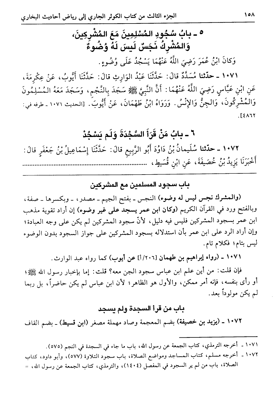 (والمشرك نجس ليس له وضوء) النجس -بفتح الجيم- مصدر، -وبكسرها- صفة، وبالفتح ورد في القرآن الكريم (وكان ابن عمر يسجد على غير وضوء) إن أراد تقوية مذهب ابن عمر بسجود المشركين فليس فيه دليل؛ لأن سجود المشركين لم يكن على وجه العبادة؛ وإن أراد الرد على ابن عمر بأن استدلاله بسجود المشركين على جواز السجود بدون الوضوء ليس بتام؛ فكلام تام.
