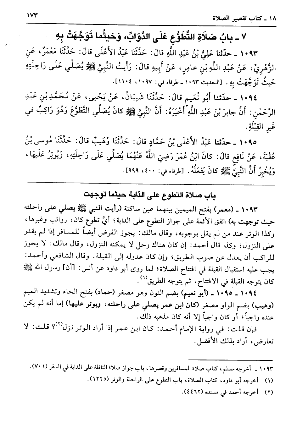 1094 - 1095 - (أبو نعيم) بضم النون وهو مصغر (حماد) بفتح الحاء وتشديد الميم (وهيب) بضم الواو مصغر (كان ابن عمر يصلي على راحلته، ويوتر عليها) إما أنه لم يكن عنده واجبًا؛ أو كان واجبًا إلا أنه كان مذهبه ذلك.