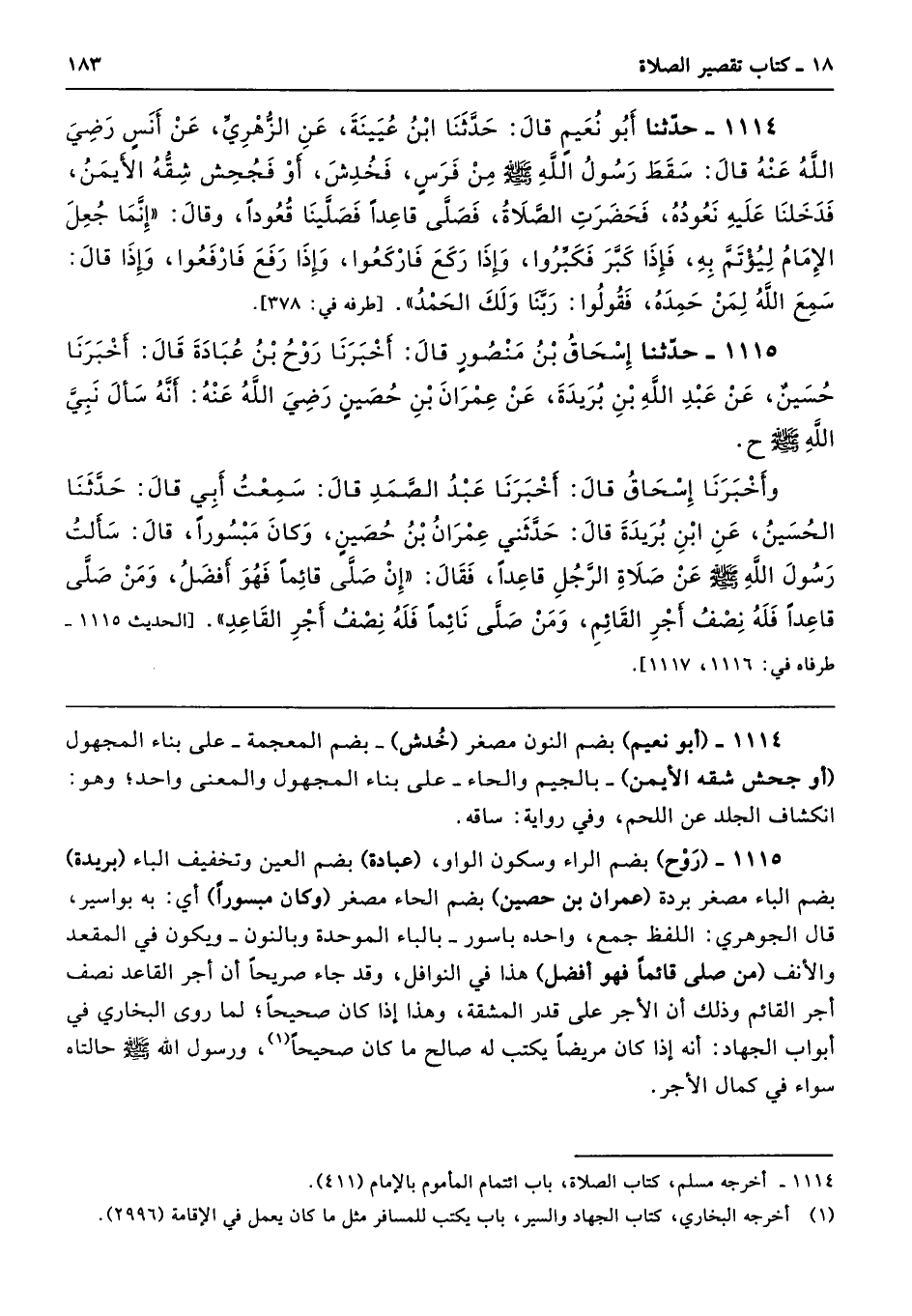 1115 - حَدَّثَنَا إِسْحَاقُ بْنُ مَنْصُورٍ قَالَ أَخْبَرَنَا رَوْحُ بْنُ عُبَادَةَ أَخْبَرَنَا حُسَيْنٌ عَنْ عَبْدِ اللَّهِ بْنِ بُرَيْدَةَ عَنْ عِمْرَانَ بْنِ حُصَيْنٍ - رضى الله عنه - أَنَّهُ سَأَلَ نَبِىَّ اللَّهِ - صلى الله عليه وسلم -. أَخْبَرَنَا إِسْحَاقُ قَالَ أَخْبَرَنَا عَبْدُ الصَّمَدِ قَالَ سَمِعْتُ أَبِى قَالَ حَدَّثَنَا الْحُسَيْنُ عَنِ ابْنِ بُرَيْدَةَ قَالَ حَدَّثَنِى عِمْرَانُ بْنُ حُصَيْنٍ - وَكَانَ مَبْسُورًا - قَالَ سَأَلْتُ رَسُولَ اللَّهِ - صلى الله عليه وسلم - عَنْ صَلاَةِ الرَّجُلِ قَاعِدًا فَقَالَ «إِنْ صَلَّى قَائِمًا فَهْوَ أَفْضَلُ، وَمَنْ صَلَّى قَاعِدًا فَلَهُ نِصْفُ أَجْرِ الْقَائِمِ، وَمَنْ صَلَّى نَائِمًا فَلَهُ نِصْفُ أَجْرِ الْقَاعِدِ». طرفاه 1116، 1117
