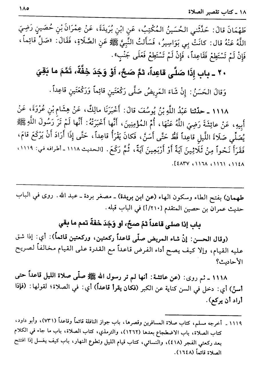1118 - حَدَّثَنَا عَبْدُ اللَّهِ بْنُ يُوسُفَ قَالَ أَخْبَرَنَا مَالِكٌ عَنْ هِشَامِ بْنِ عُرْوَةَ عَنْ أَبِيهِ عَنْ عَائِشَةَ - رضى الله عنها - أُمِّ الْمُؤْمِنِينَ أَنَّهَا أَخْبَرَتْهُ أَنَّهَا لَمْ تَرَ رَسُولَ اللَّهِ - صلى الله عليه وسلم - يُصَلِّى صَلاَةَ اللَّيْلِ قَاعِدًا قَطُّ حَتَّى أَسَنَّ، فَكَانَ يَقْرَأُ قَاعِدًا حَتَّى إِذَا أَرَادَ أَنْ يَرْكَعَ قَامَ، فَقَرَأَ نَحْوًا مِنْ ثَلاَثِينَ آيَةً أَوْ أَرْبَعِينَ آيَةً، ثُمَّ رَكَعَ. أطرافه 1119، 1148، 1161، 1168، 4837