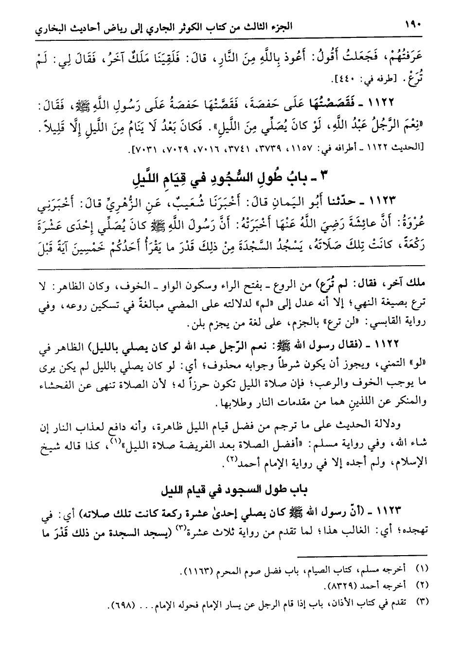 1122 - (فقال رسول الله - صلى الله عليه وسلم -: نعم الرَّجل عبد الله لو كان يصلي بالليل) الظاهر في "لو" التمني، ويجوز أن يكون شرطًا وجوابه محذوف؛ أي: لو كان يصلي بالليل لم يكن يرى ما يوجب الخوف والرعب؛ فإن صلاة الليل تكون حرزًا له؛ لأن الصلاة تنهى عن الفحشاء والمنكر عن اللذينِ هما من مقدمات النَّار وطلابها.