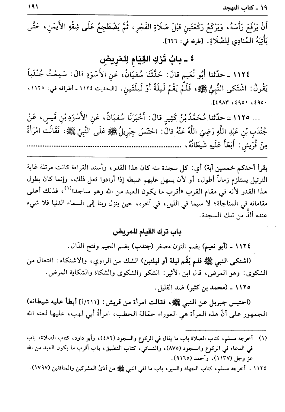 1124 - حَدَّثَنَا أَبُو نُعَيْمٍ قَالَ حَدَّثَنَا سُفْيَانُ عَنِ الأَسْوَدِ قَالَ سَمِعْتُ جُنْدَبًا يَقُولُ اشْتَكَى النَّبِىُّ - صلى الله عليه وسلم - فَلَمْ يَقُمْ لَيْلَةً أَوْ لَيْلَتَيْنِ. أطرافه 1125، 4950، 4951، 4983