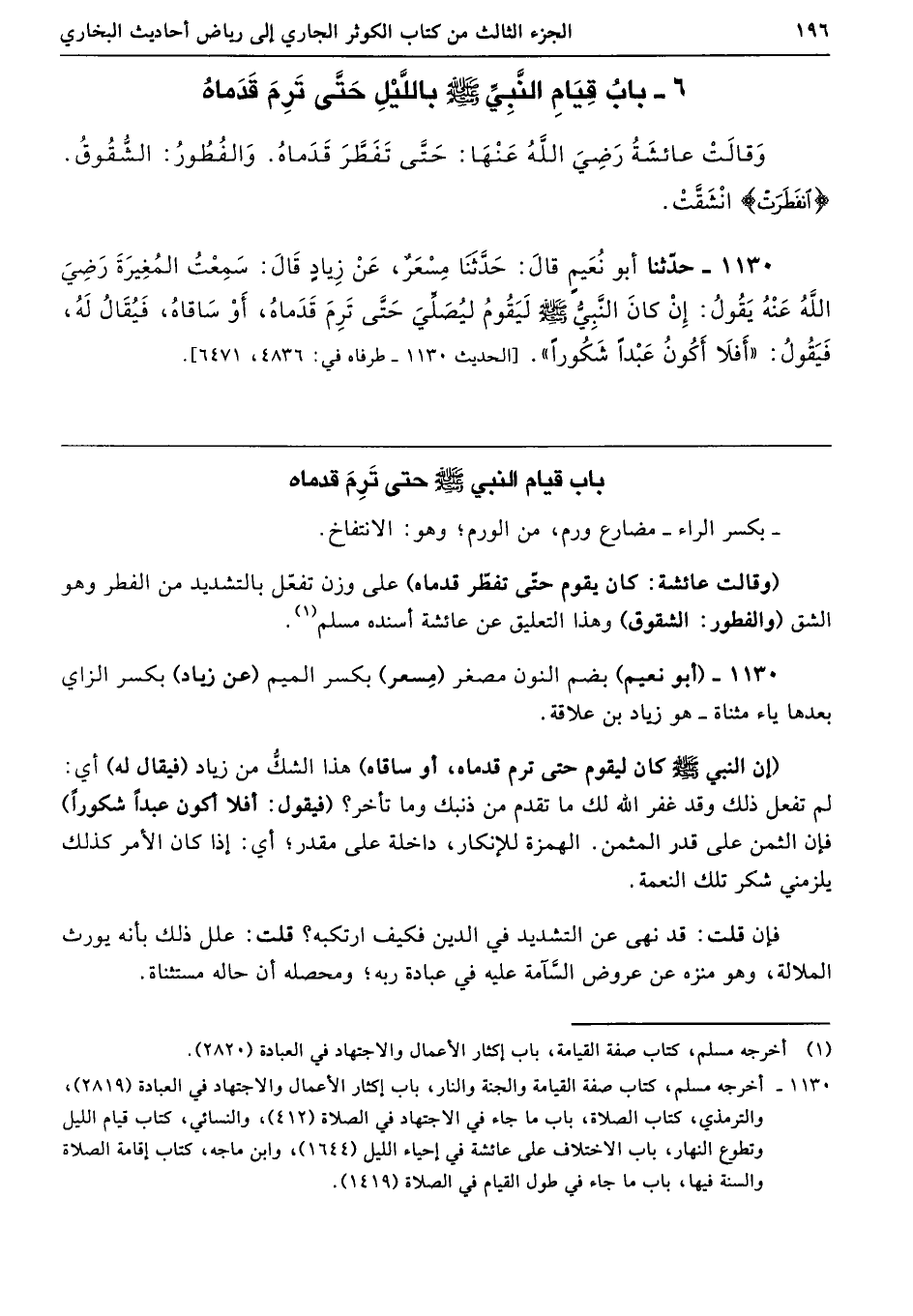 1130 - حَدَّثَنَا أَبُو نُعَيْمٍ قَالَ حَدَّثَنَا مِسْعَرٌ عَنْ زِيَادٍ قَالَ سَمِعْتُ الْمُغِيرَةَ - رضى الله عنه - يَقُولُ إِنْ كَانَ النَّبِىُّ - صلى الله عليه وسلم - لَيَقُومُ لِيُصَلِّىَ حَتَّى تَرِمُ قَدَمَاهُ أَوْ سَاقَاهُ، فَيُقَالُ لَهُ فَيَقُولُ «أَفَلاَ أَكُونُ عَبْدًا شَكُورًا». طرفاه 4836، 6471