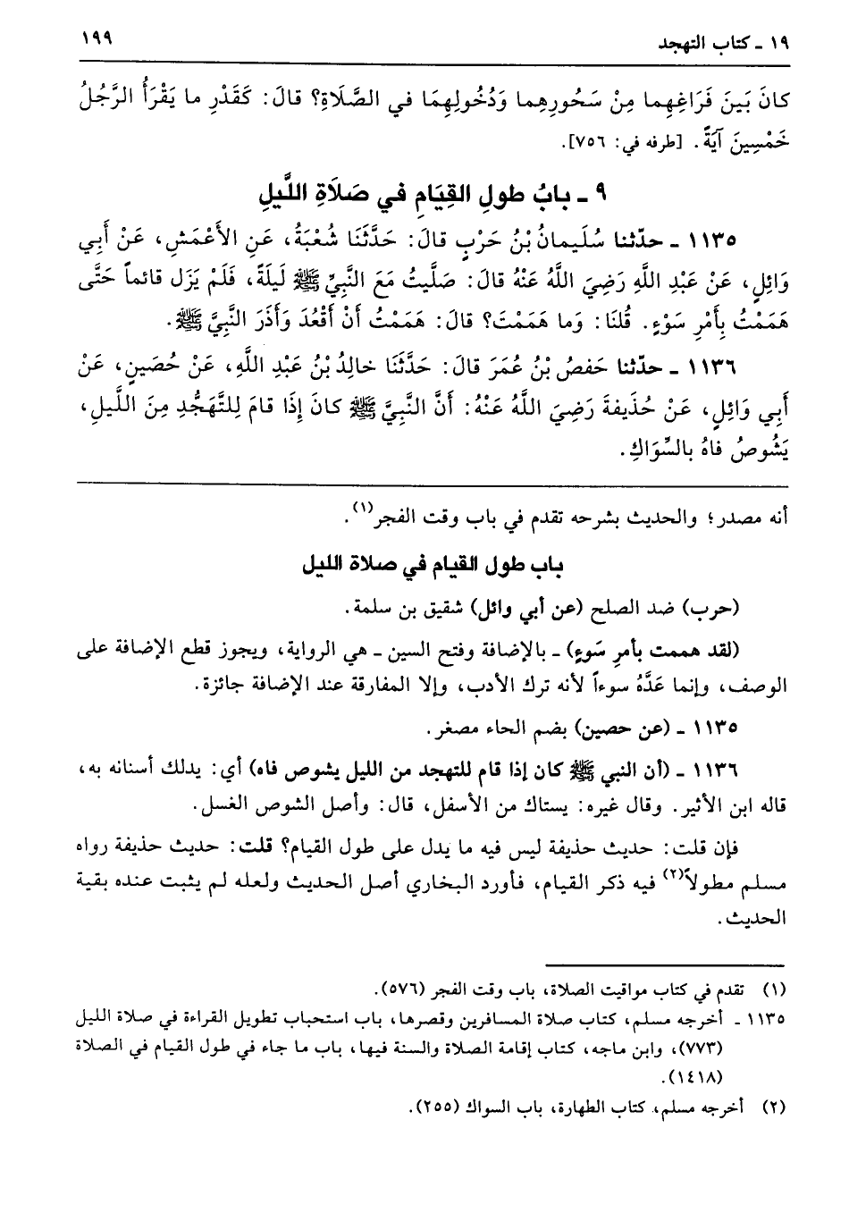 1135 - حَدَّثَنَا سُلَيْمَانُ بْنُ حَرْبٍ، قَالَ: حَدَّثَنَا شُعْبَةُ، عَنِ الأَعْمَشِ، عَنْ أَبِي وَائِلٍ، عَنْ عَبْدِ اللَّهِ رَضِيَ اللَّهُ عَنْهُ، قَالَ: «صَلَّيْتُ مَعَ النَّبِيِّ صَلَّى اللهُ عَلَيْهِ وَسَلَّمَ لَيْلَةً، فَلَمْ يَزَلْ قَائِمًا حَتَّى هَمَمْتُ بِأَمْرِ سَوْءٍ»، قُلْنَا: وَمَا هَمَمْتَ؟ قَالَ: هَمَمْتُ أَنْ أَقْعُدَ وَأَذَرَ النَّبِيَّ صَلَّى اللهُ عَلَيْهِ وَسَلَّمَ.
