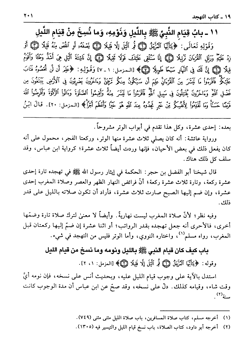 11 - باب قِيَامِ النَّبِيِّ - صلى الله عليه وسلم - بِاللَّيْلِ وَنَوْمِهِ وَمَا نُسِخَ مِنْ قِيَامِ اللَّيْلِ. (488) وَقَوْلِهِ تَعَالَى (يَا أَيُّهَا الْمُزَّمِّلُ * قُمِ اللَّيْلَ إِلاَّ قَلِيلاً * نِصْفَهُ أَوِ انْقُصْ مِنْهُ قَلِيلاً * أَوْ زِدْ عَلَيْهِ وَرَتِّلِ الْقُرْآنَ تَرْتِيلاً * إِنَّا سَنُلْقِى عَلَيْكَ قَوْلاً ثَقِيلاً * إِنَّ نَاشِئَةَ اللَّيْلِ هِىَ أَشَدُّ وِطَاءً وَأَقْوَمُ قِيلاً * إِنَّ لَكَ فِي النَّهَارِ سَبْحًا طَوِيلاً) وَقَوْلِهِ (عَلِمَ أَنْ لَنْ تُحْصُوهُ فَتَابَ عَلَيْكُمْ فَاقْرَءُوا مَا تَيَسَّرَ مِنَ الْقُرْآنِ عَلِمَ أَنْ سَيَكُونُ مِنْكُمْ مَرْضَى وَآخَرُونَ يَضْرِبُونَ فِي الأَرْضِ يَبْتَغُونَ مِنْ فَضْلِ اللَّهِ وَآخَرُونَ يُقَاتِلُونَ فِي سَبِيلِ اللَّهِ فَاقْرَءُوا مَا تَيَسَّرَ مِنْهُ وَأَقِيمُوا الصَّلاَةَ وَآتُوا الزَّكَاةَ وَأَقْرِضُوا اللَّهَ قَرْضًا حَسَنًا وَمَا تُقَدِّمُوا لأَنْفُسِكُمْ مِنْ خَيْرٍ تَجِدُوهُ عِنْدَ اللَّهِ هُوَ خَيْرًا وَأَعْظَمَ أَجْرًا). قَالَ ابْنُ