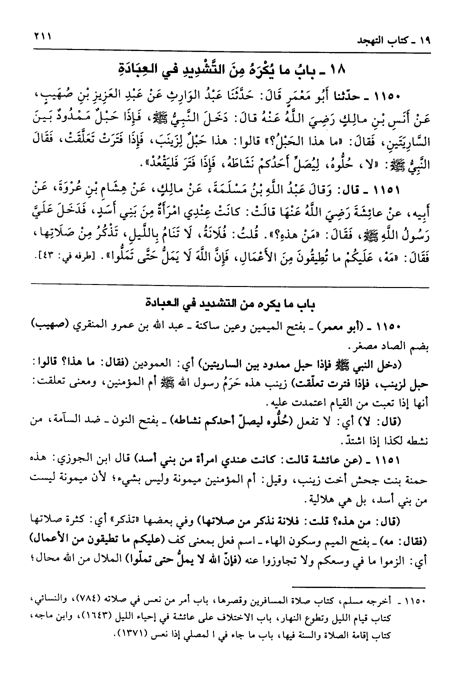 1150 - حَدَّثَنَا أَبُو مَعْمَرٍ حَدَّثَنَا عَبْدُ الْوَارِثِ عَنْ عَبْدِ الْعَزِيزِ بْنِ صُهَيْبٍ عَنْ أَنَسِ بْنِ مَالِكٍ - رضى الله عنه - قَالَ دَخَلَ النَّبِىُّ - صلى الله عليه وسلم - فَإِذَا حَبْلٌ مَمْدُودٌ بَيْنَ السَّارِيَتَيْنِ فَقَالَ «مَا هَذَا الْحَبْلُ». قَالُوا هَذَا حَبْلٌ لِزَيْنَبَ فَإِذَا فَتَرَتْ تَعَلَّقَتْ. فَقَالَ النَّبِىُّ - صلى الله عليه وسلم - «لاَ، حُلُّوهُ، لِيُصَلِّ أَحَدُكُمْ نَشَاطَهُ، فَإِذَا فَتَرَ فَلْيَقْعُدْ».
