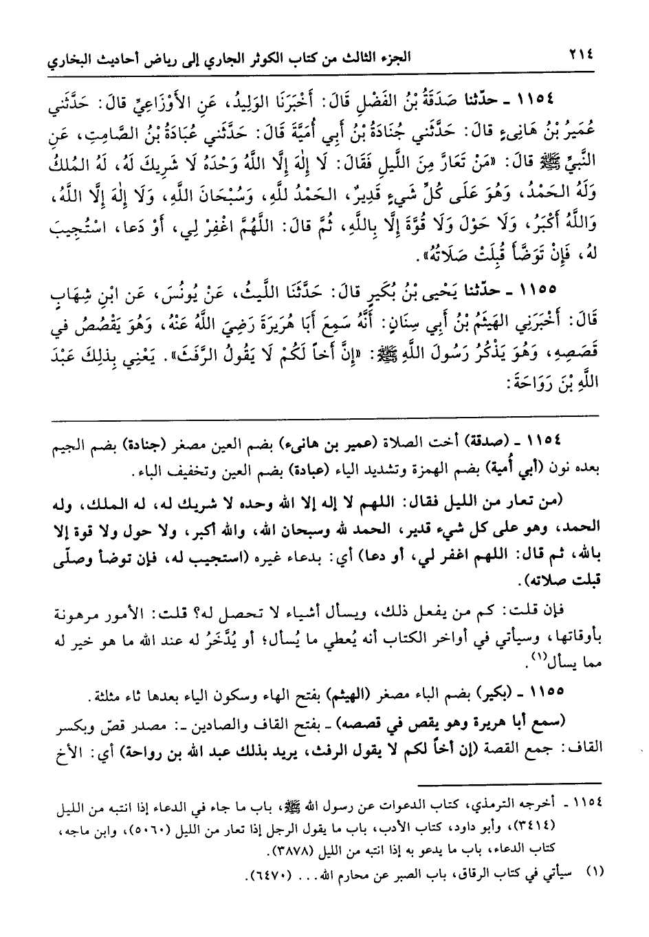 1154 - (صدقة) أخت الصلاة (عمير بن هانئ) بضم العين مصغر (جنادة) بضم الجيم بعده نون (أبي أُمية) بضم الهمزة وتشديد الياء (عبادة) بضم العين وتخفيف الباء.