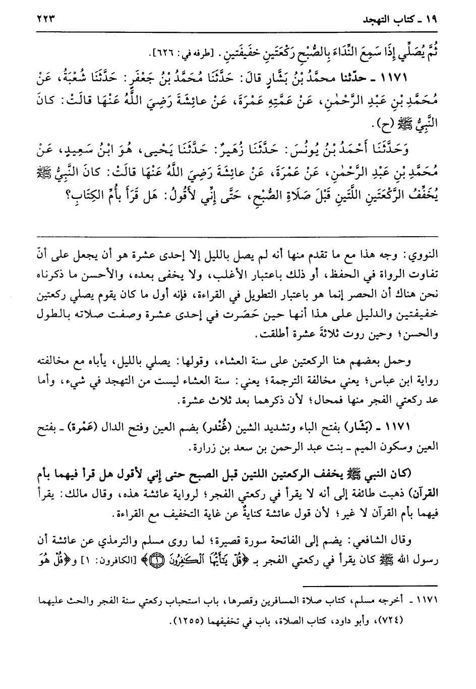 1171 - حَدَّثَنَا مُحَمَّدُ بْنُ بَشَّارٍ قَالَ حَدَّثَنَا مُحَمَّدُ بْنُ جَعْفَرٍ حَدَّثَنَا شُعْبَةُ عَنْ مُحَمَّدِ بْنِ عَبْدِ الرَّحْمَنِ عَنْ عَمَّتِهِ عَمْرَةَ عَنْ عَائِشَةَ - رضى الله عنها - قَالَتْ كَانَ النَّبِىُّ - صلى الله عليه وسلم - ح وَحَدَّثَنَا أَحْمَدُ بْنُ يُونُسَ حَدَّثَنَا زُهَيْرٌ حَدَّثَنَا يَحْيَى - هُوَ ابْنُ سَعِيدٍ - عَنْ مُحَمَّدِ بْنِ عَبْدِ الرَّحْمَنِ عَنْ عَمْرَةَ عَنْ عَائِشَةَ - رضى الله عنها - قَالَتْ كَانَ النَّبِىُّ - صلى الله عليه وسلم - يُخَفِّفُ الرَّكْعَتَيْنِ اللَّتَيْنِ قَبْلَ صَلاَةِ الصُّبْحِ حَتَّى إِنِّى لأَقُولُ هَلْ قَرَأَ بِأُمِّ الْكِتَابِ.