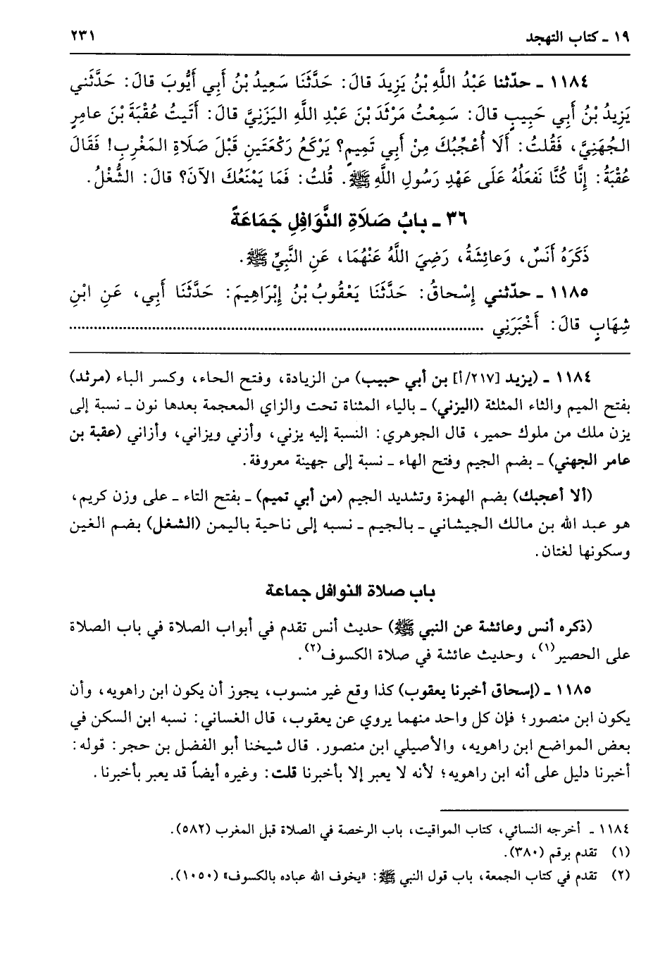 1184 - (يزيد بن أبي حبيب) من الزيادة، وفتح الحاء، وكسر الباء (مرثد) بفتح الميم والثاء المثلثة (اليزني) -بالياء المثناة تحت والزاي المعجمة بعدها نون- نسبة إلى يزن ملك من ملوك حمير، قال الجوهري: النسبة إليه يزني، وأزني ويزاني، وأزاني (عقبة بن عامر الجهني) -بضم الجيم وفتح الهاء- نسبة إلى جهينة معروفة.