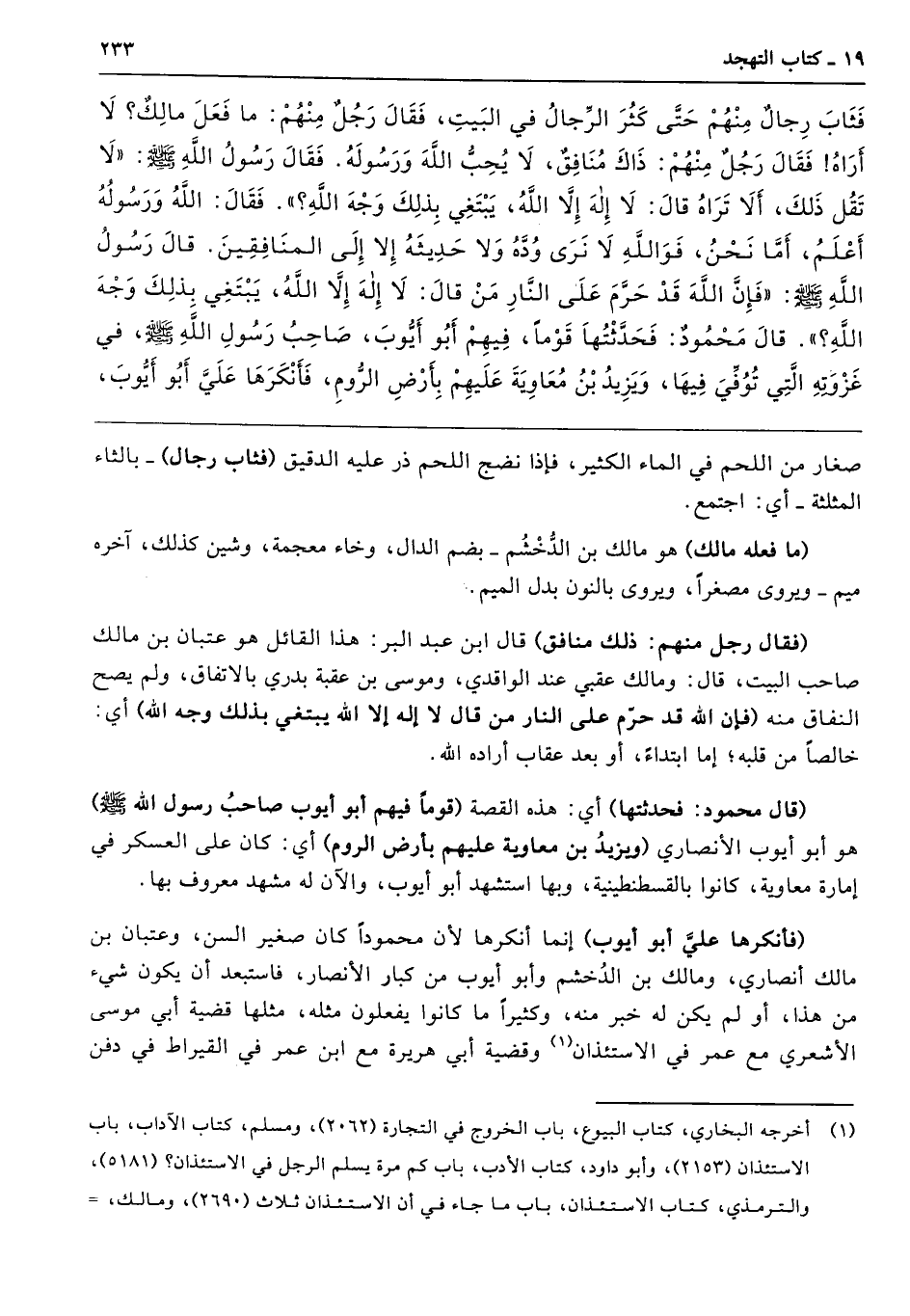 فَثَابَ رِجَالٌ مِنْهُمْ حَتَّى كَثُرَ الرِّجَالُ فِي الْبَيْتِ. فَقَالَ رَجُلٌ مِنْهُمْ مَا فَعَلَ مَالِكٌ لاَ أَرَاهُ. فَقَالَ رَجُلٌ مِنْهُمْ ذَاكَ مُنَافِقٌ لاَ يُحِبُّ اللَّهَ وَرَسُولَهُ. فَقَالَ رَسُولُ اللَّهِ - صلى الله عليه وسلم - «لاَ تَقُلْ ذَاكَ أَلاَ تَرَاهُ قَالَ لاَ إِلَهَ إِلاَّ اللَّهُ. يَبْتَغِى بِذَلِكَ وَجْهَ اللَّهِ». فَقَالَ اللَّهُ وَرَسُولُهُ أَعْلَمُ. أَمَّا نَحْنُ فَوَاللَّهِ لاَ نَرَى وُدَّهُ وَلاَ حَدِيثَهُ إِلاَّ إِلَى الْمُنَافِقِينَ. قَالَ رَسُولُ اللَّهِ - صلى الله عليه وسلم - «فَإِنَّ اللَّهَ قَدْ حَرَّمَ عَلَى النَّارِ مَنْ قَالَ لاَ إِلَهَ إِلاَّ اللَّهُ. يَبْتَغِى بِذَلِكَ وَجْهَ اللَّهِ». قَالَ مَحْمُودٌ فَحَدَّثْتُهَا قَوْمًا فِيهِمْ أَبُو أَيُّوبَ صَاحِبُ رَسُولِ اللَّهِ - صلى الله عليه وسلم - فِي غَزْوَتِهِ الَّتِى تُوُفِّىَ فِيهَا وَيَزِيدُ بْنُ مُعَاوِيَةَ عَلَيْهِمْ بِأَرْضِ الرُّومِ، فَأَنْكَرَهَا عَلَىَّ أَبُو أَيُّوبَ