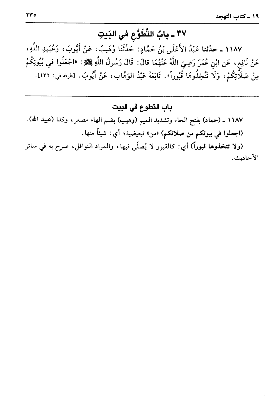 1187 - حَدَّثَنَا عَبْدُ الأَعْلَى بْنُ حَمَّادٍ حَدَّثَنَا وُهَيْبٌ عَنْ أَيُّوبَ وَعُبَيْدِ اللَّهِ عَنْ نَافِعٍ عَنِ ابْنِ عُمَرَ - رضى الله عنهما - قَالَ قَالَ رَسُولُ اللَّهِ - صلى الله عليه وسلم - «اجْعَلُوا فى بُيُوتِكُمْ مِنْ صَلاَتِكُمْ وَلاَ تَتَّخِذُوهَا قُبُورًا». تَابَعَهُ عَبْدُ الْوَهَّابِ عَنْ أَيُّوبَ. طرفه 432