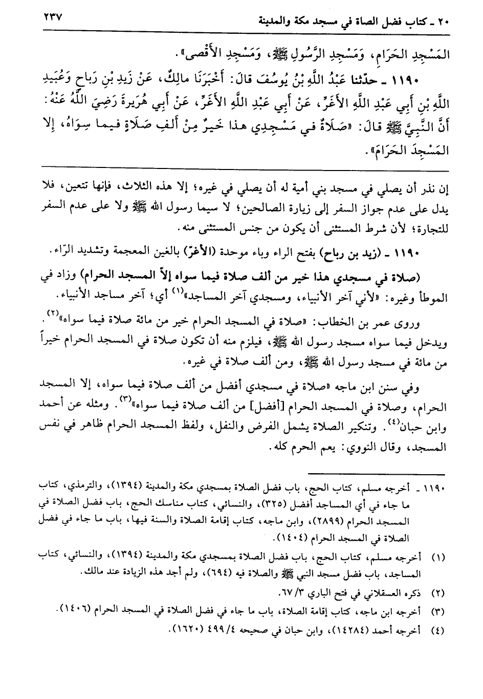 (صلاة في مسجدي هذا خير من ألف صلاة فيما سواه إلاّ المسجد الحرام) وزاد في الموطأ وغيره: "لأني آخر الأنبياء، ومسجدي آخر المساجد" أي؛ آخر مساجد الأنبياء.