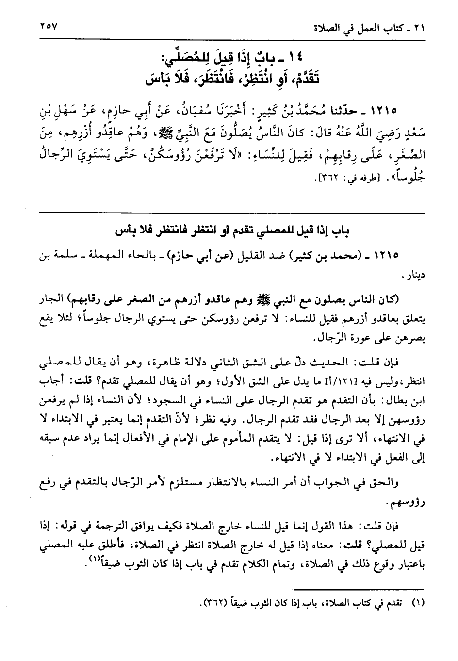 1215 - حَدَّثَنَا مُحَمَّدُ بْنُ كَثِيرٍ أَخْبَرَنَا سُفْيَانُ عَنْ أَبِى حَازِمٍ عَنْ سَهْلِ بْنِ سَعْدٍ - رضى الله عنه - قَالَ كَانَ النَّاسُ يُصَلُّونَ مَعَ النَّبِيِّ - صلى الله عليه وسلم - وَهُمْ عَاقِدُو أُزْرِهِمْ مِنَ الصِّغَرِ عَلَى رِقَابِهِمْ، فَقِيلَ لِلنِّسَاءِ «لاَ تَرْفَعْنَ رُءُوسَكُنَّ حَتَّى يَسْتَوِىَ الرِّجَالُ جُلُوسًا». طرفه 362