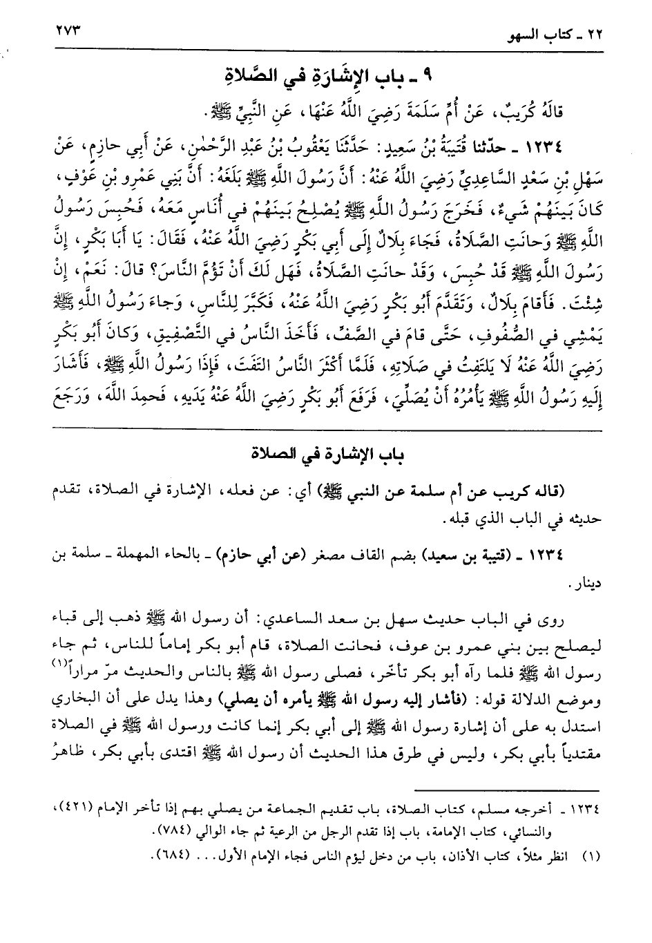 1234 - حَدَّثَنَا قُتَيْبَةُ بْنُ سَعِيدٍ حَدَّثَنَا يَعْقُوبُ بْنُ عَبْدِ الرَّحْمَنِ عَنْ أَبِى حَازِمٍ عَنْ سَهْلِ بْنِ سَعْدٍ السَّاعِدِىِّ - رضى الله عنه - أَنَّ رَسُولَ اللَّهِ - صلى الله عليه وسلم - بَلَغَهُ أَنَّ بَنِى عَمْرِو بْنِ عَوْفٍ كَانَ بَيْنَهُمْ شَىْءٌ فَخَرَجَ رَسُولُ اللَّهِ - صلى الله عليه وسلم - يُصْلِحُ بَيْنَهُمْ فِي أُنَاسٍ مَعَهُ، فَحُبِسَ رَسُولُ اللَّهِ - صلى الله عليه وسلم - وَحَانَتِ الصَّلاَةُ فَجَاءَ بِلاَلٌ إِلَى أَبِى بَكْرٍ - رضى الله عنه - فَقَالَ يَا أَبَا بَكْرٍ إِنَّ رَسُولَ اللَّهِ - صلى الله عليه وسلم - قَدْ حُبِسَ وَقَدْ حَانَتِ الصَّلاَةُ فَهَلْ لَكَ أَنْ تَؤُمَّ النَّاسَ قَالَ نَعَمْ إِنْ شِئْتَ. فَأَقَامَ بِلاَلٌ وَتَقَدَّمَ أَبُو بَكْرٍ - رضى الله عنه - فَكَبَّرَ لِلنَّاسِ وَجَاءَ رَسُولُ اللَّهِ - صلى الله عليه وسلم - يَمْشِى فِي الصُّفُوفِ حَتَّى قَامَ فِي الصَّفِّ، فَأَخَذَ النَّاسُ فِي التَّصْفِيقِ، وَكَانَ أَبُو بَكْرٍ - رضى الله عنه - لاَ يَلْتَفِتُ فِي صَلاَتِهِ، فَلَمَّا أَكْثَرَ النَّاسُ الْتَفَتَ فَإِذَا رَسُولُ اللَّهِ - صلى الله عليه وسلم - فَأَشَارَ إِلَيْهِ رَسُولُ اللَّهِ - صلى الله عليه وسلم - يَأْمُرُهُ أَنْ يُصَلِّىَ، فَرَفَعَ أَبُو بَكْرٍ - رضى الله عنه - يَدَيْهِ فَحَمِدَ اللَّهَ وَرَجَعَ