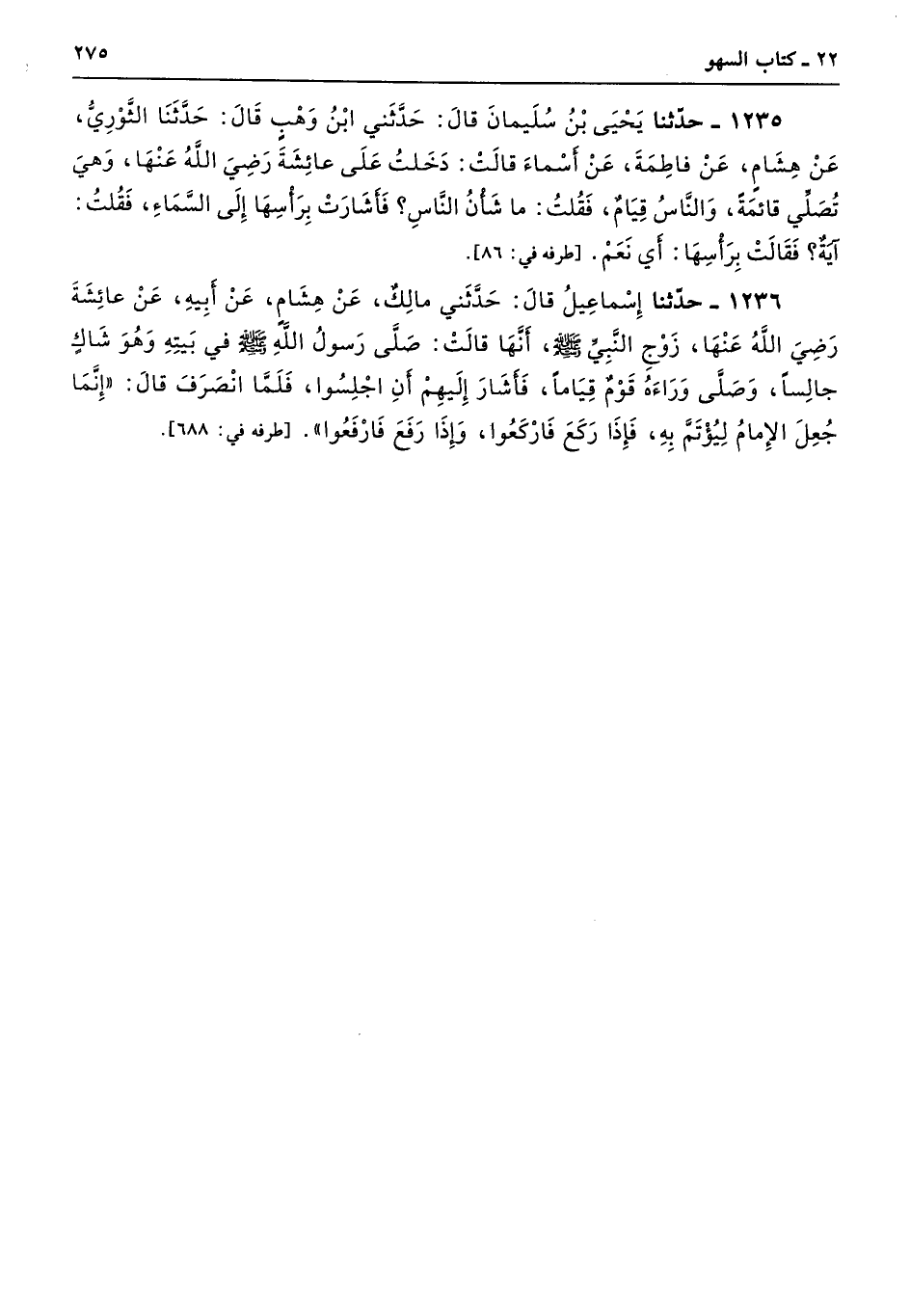 1235 - حَدَّثَنَا يَحْيَى بْنُ سُلَيْمَانَ قَالَ حَدَّثَنِى ابْنُ وَهْبٍ حَدَّثَنَا الثَّوْرِىُّ عَنْ هِشَامٍ عَنْ فَاطِمَةَ عَنْ أَسْمَاءَ قَالَتْ دَخَلْتُ عَلَى عَائِشَةَ - رضى الله عنها - وَهِىَ تُصَلِّى قَائِمَةً وَالنَّاسُ قِيَامٌ فَقُلْتُ مَا شَأْنُ النَّاسِ فَأَشَارَتْ بِرَأْسِهَا إِلَى السَّمَاءِ. فَقُلْتُ آيَةٌ. فَقَالَتْ بِرَأْسِهَا أَىْ نَعَمْ. طرفه 86
