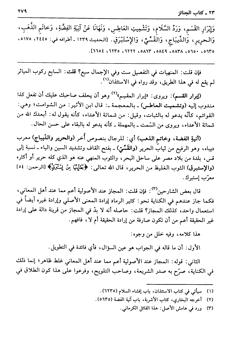 وَإِبْرَارِ الْقَسَمِ، وَرَدِّ السَّلاَمِ، وَتَشْمِيتِ الْعَاطِسِ. وَنَهَانَا عَنْ آنِيَةِ الْفِضَّةِ، وَخَاتَمِ الذَّهَبِ، وَالْحَرِيرِ، وَالدِّيبَاجِ، وَالْقَسِّىِّ، وَالإِسْتَبْرَقِ. أطرافه 2445، 5175، 5635، 5650، 5838، 5849، 5863، 6222، 6235، 6654