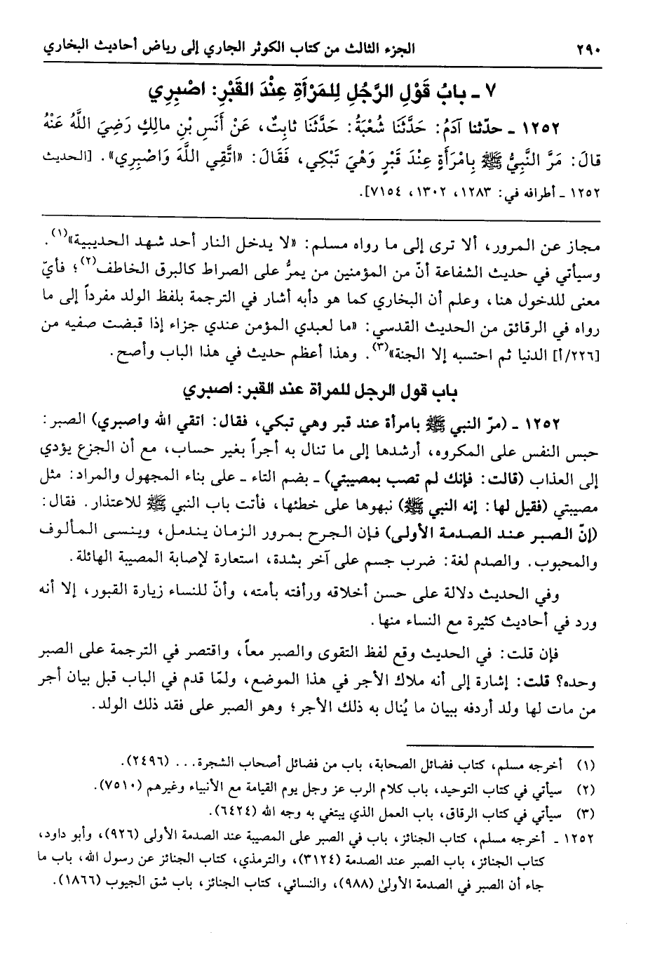 1252 - حَدَّثَنَا آدَمُ حَدَّثَنَا شُعْبَةُ حَدَّثَنَا ثَابِتٌ عَنْ أَنَسِ بْنِ مَالِكٍ - رضى الله عنه - قَالَ مَرَّ النَّبِىُّ - صلى الله عليه وسلم - بِامْرَأَةٍ عِنْدَ قَبْرٍ وَهِىَ تَبْكِى فَقَالَ «اتَّقِى اللَّهَ وَاصْبِرِى». أطرافه 1283، 1302، 7154