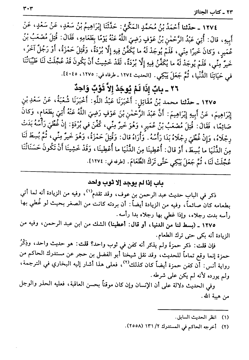 ذكر في الباب حديث عبد الرحمن بن عوف، وقد تقدم، وفيه من الزيادة أنَّه لما أتي بطعامه كان صائمًا، وفيه من الزيادة أيضًا: أن بردته كانت من الصغر بحيث لو غُطي بها رأسه بدت رجلاه، وإذا غطي بها رجلاه بدا رأسه.