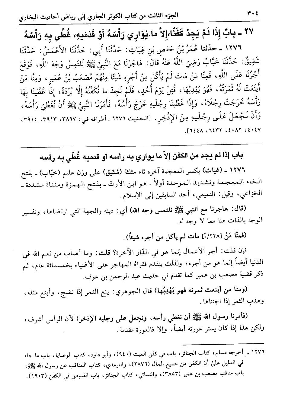 1276 - حَدَّثَنَا عُمَرُ بْنُ حَفْصِ بْنِ غِيَاثٍ حَدَّثَنَا أَبِى حَدَّثَنَا الأَعْمَشُ حَدَّثَنَا شَقِيقٌ حَدَّثَنَا خَبَّابٌ - رضى الله عنه - قَالَ هَاجَرْنَا مَعَ النَّبِيِّ - صلى الله عليه وسلم - نَلْتَمِسُ وَجْهَ اللَّهِ، فَوَقَعَ أَجْرُنَا عَلَى اللَّهِ، فَمِنَّا مَنْ مَاتَ لَمْ يَأْكُلْ مِنْ أَجْرِهِ شَيْئًا مِنْهُمْ مُصْعَبُ بْنُ عُمَيْرٍ، وَمِنَّا مَنْ أَيْنَعَتْ لَهُ ثَمَرَتُهُ فَهُوَ يَهْدِبُهَا. قُتِلَ يَوْمَ أُحُدٍ، فَلَمْ نَجِدْ مَا نُكَفِّنُهُ إِلاَّ بُرْدَةً إِذَا غَطَّيْنَا بِهَا رَأْسَهُ خَرَجَتْ رِجْلاَهُ، وَإِذَا غَطَّيْنَا رِجْلَيْهِ خَرَجَ رَأْسُهُ، فَأَمَرَنَا النَّبِىُّ - صلى الله عليه وسلم - أَنْ نُغَطِّىَ رَأْسَهُ، وَأَنْ نَجْعَلَ عَلَى رِجْلَيْهِ مِنَ الإِذْخِرِ. أطرافه 3897، 3913، 3914، 4047، 4082، 6432، 6448