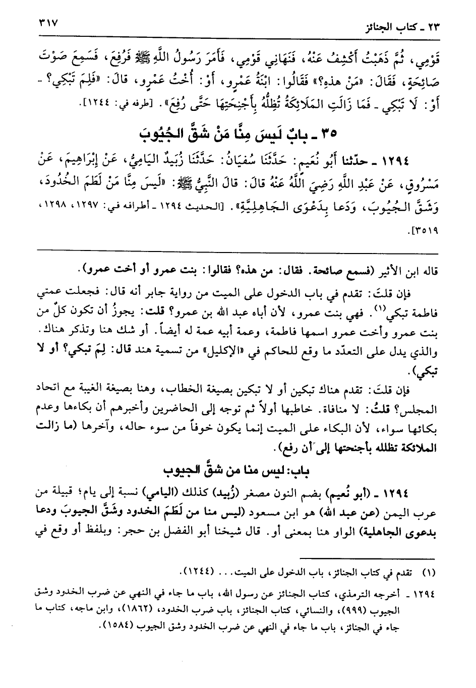 1294 - (أبو نُعيم) بضم النون مصغر (زُبيد) كذلك (اليامي) نسبة إلى يام؛ قبيلة من عرب اليمن (عن عبد الله) هو ابن مسعود اليس منا من لَطَمَ الخدود وشَقَّ الجيوبَ ودعا بدعوى الجاهلية) الواو هنا بمعنى أو. قال شيخنا أبو الفضل بن حجر: وبلفظ أو وقع في