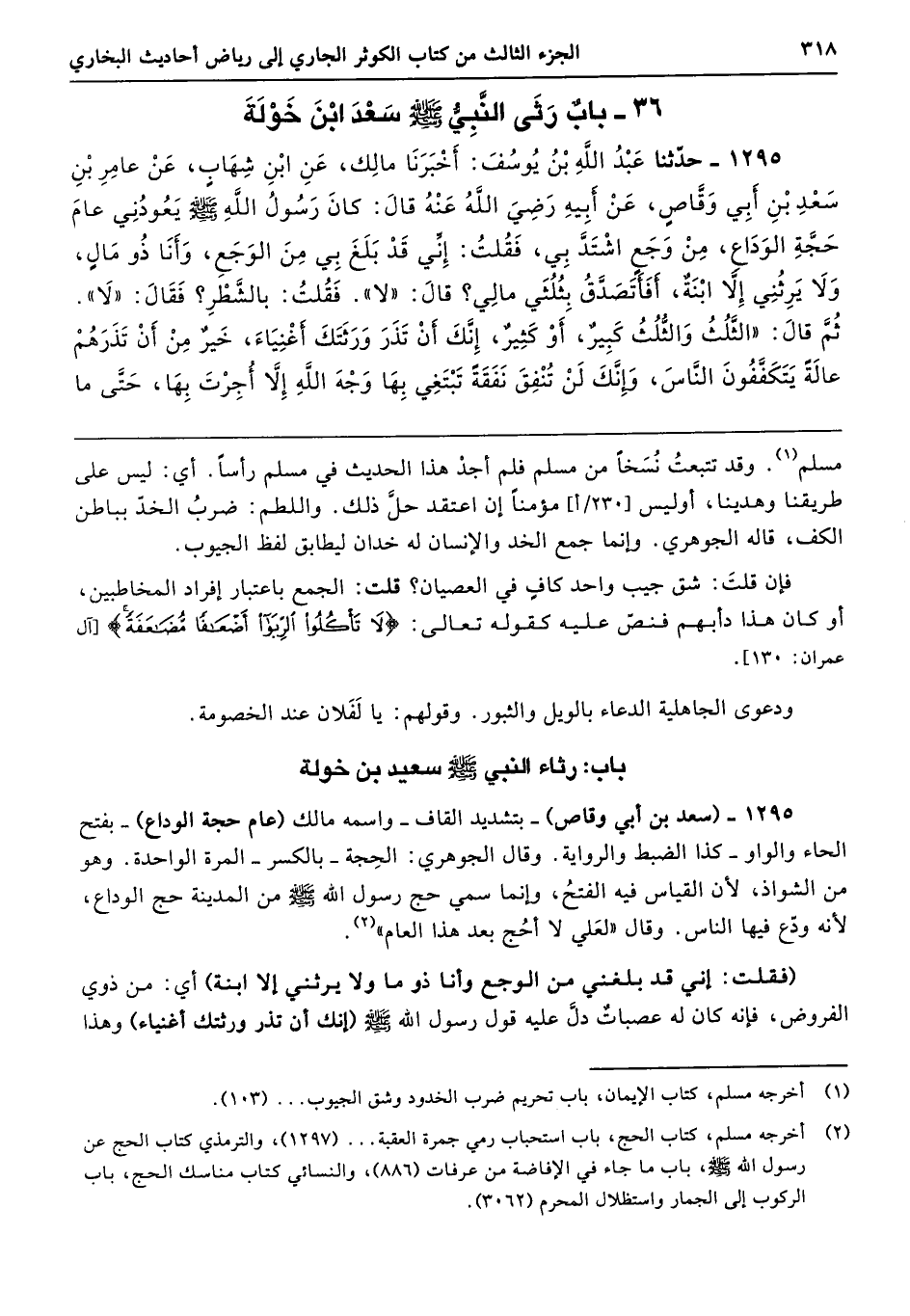 1295 - (سعد بن أبي وقاص) -بتشديد القاف- واسمه مالك (عام حجة الوداع) -بفتح الحاء والواو- كذا الضبط والرواية. وقال الجوهري: الحِجة -بالكسر- المرة الواحدة. وهو من الشواذ، لأن القياس فيه الفتحُ، وإنما سمي حج رسول الله - صلى الله عليه وسلم - من المدينة حج الوداع، لأنه ودّع فيها الناس. وقال "لعَلي لا أحُج بعد هذا العام".