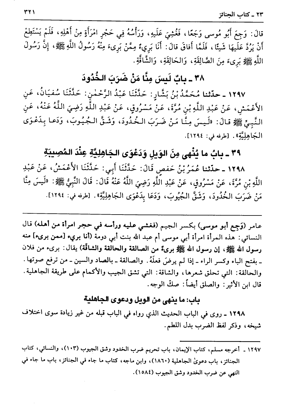 1298 - حَدَّثَنَا عُمَرُ بْنُ حَفْصٍ حَدَّثَنَا أَبِى حَدَّثَنَا الأَعْمَشُ عَنْ عَبْدِ اللَّهِ بْنِ مُرَّةَ عَنْ مَسْرُوقٍ عَنْ عَبْدِ اللَّهِ - رضى الله عنه - قَالَ قَالَ النَّبِىُّ - صلى الله عليه وسلم - «لَيْسَ مِنَّا مَنْ ضَرَبَ الْخُدُودَ، وَشَقَّ الْجُيُوبَ، وَدَعَا بِدَعْوَى الْجَاهِلِيَّةِ». طرفه 1294
