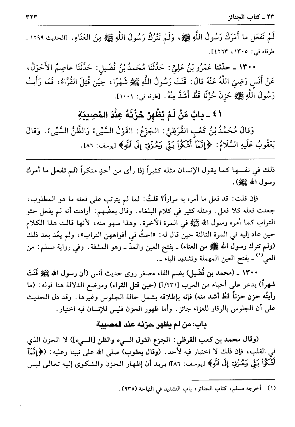 1300 - (محمد بن فُضَيل) بضم الفاء مصغر روى حديث أنس (أن رسول الله - صلى الله عليه وسلم - قَنَتَ شهرًا) يدعو على أحياء من العرب (حين قتل القراء) وموضع الدلالة هنا قوله: (ما رأيتُه حزن حزنًا قطُ أشد منه) فإنه بإطلاقه يشمل حالة الجلوس وغيرها. وقد دل الحديث على أن الجلوس بالوقار للعزاء جائز. وأما ظهور الحزن فليس لإنسان فيه اختيار.