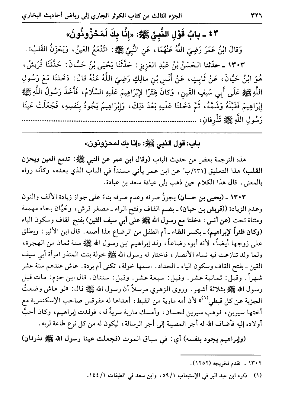 1303 - (يحيى بن حسان) يجوزُ صرفه وعدم صرفه بناءً على جواز زيادة الألف والنون وعدم الزيادة ((قريش بن حيان) -بضم القاف وفتح الراء- مصغر قرش، وحَيّان بحاء مهملة ومثناة تحت (عن أنس: دخلنا مع رسول الله - صلى الله عليه وسلم - على أبي سيف القين) بفتح القاف وسكون الياء (وكان ظئرًا لإبراهيم) -بكسر الظاء- أم الطفل من الرضاع هذا أصله. قال ابن الأثير: ويطلق على زوجها أيضًا، لأنه أبوه رضاعًا، ولد إبراهيم ابن رسول الله - صلى الله عليه وسلم - سنة ثمان من الهجرة، ولما ولد تنازعت فيه نساء الأنصار، فاختار له رسول الله - صلى الله عليه وسلم - خولة بنت المنذر امرأة أبي سيف القين -بفتح القاف وسكون الياء- الحداد. اسمها خولة، تكنى أم بردة. عاش عندهم ستة عشر شهرًا. وقيل: ثمانية عشر. وقيل: سبعة عشر. وقيل: سنتان. قال ابن حزم: مات قبل رسول الله - صلى الله عليه وسلم - بثلاثة أشهر. وروى الزهريّ مرسلًا أن رسول الله - صلى الله عليه وسلم - قال: "لو عاش وضعتُ الجزية عن كل قبطي" لأن أمه مارية من القبط، أهداها له مقوقس صاحب الإسكندرية مع أختها سيرين، فوهب سيرين لحسان، وأمسك مارية سريةً له، فولدت إبراهيم، وكان أحبَّ أولاده إليه فأضاف الله له أجر المصيبة إلى أجر الرسالة، ليكون له من كل نوع طاعة لربه.