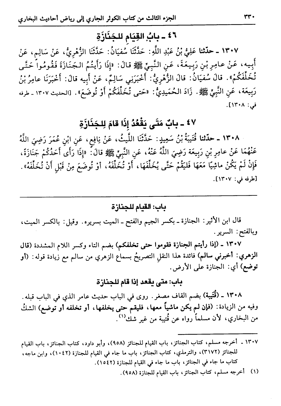 1308 - حَدَّثَنَا قُتَيْبَةُ بْنُ سَعِيدٍ حَدَّثَنَا اللَّيْثُ عَنْ نَافِعٍ عَنِ ابْنِ عُمَرَ - رضى الله عنهما - عَنْ عَامِرِ بْنِ رَبِيعَةَ - رضى الله عنه - عَنِ النَّبِيِّ - صلى الله عليه وسلم - قَالَ «إِذَا رَأَى أَحَدُكُمْ جَنَازَةً فَإِنْ لَمْ يَكُنْ مَاشِيًا مَعَهَا فَلْيَقُمْ حَتَّى يُخَلِّفَهَا، أَوْ تُخَلِّفَهُ أَوْ تُوضَعَ مِنْ قَبْلِ أَنْ تُخَلِّفَهُ». طرفه 1307