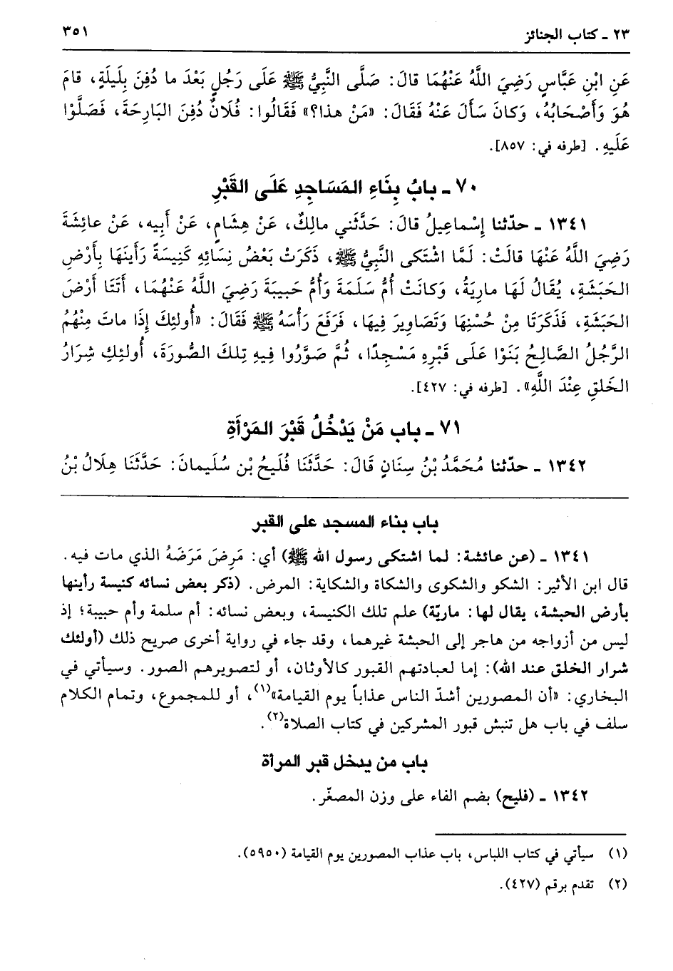 1341 - (عن عائشة: لما اشتكى رسول الله - صلى الله عليه وسلم -) أي: مَرِضَ مَرَضَهُ الذي مات فيه. قال ابن الأثير: الشكو والشكوى والشكاة والشكاية: المرض. (ذكر بعض نسائه كنيسة رأينها بأرض الحبشة، يقال لها: ماريّة) علم تلك الكنيسة، وبعض نسائه: أم سلمة وأم حبيبة؛ إذ ليس من أزواجه من هاجر إلى الحبشة غيرهما، وقد جاء في رواية أخرى صريح ذلك (أولئك شرار الخلق عند الله): إما لعبادتهم القبور كالأوثان، أو لتصويرهم الصور. وسيأتي في البخاري: "أن المصورين أشدّ الناس عذابًا يوم القيامة"، أو للمجموع، وتمام الكلام سلف في باب هل تنبش قبور المشركين في كتاب الصلاة.