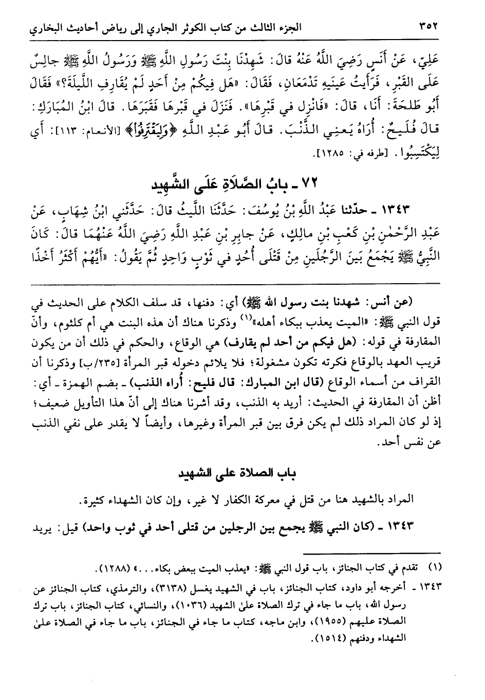 1343 - (كان النبي - صلى الله عليه وسلم - يجمع بين الرجلين من قتلى أحد في ثوب واحد) قيل: يريد