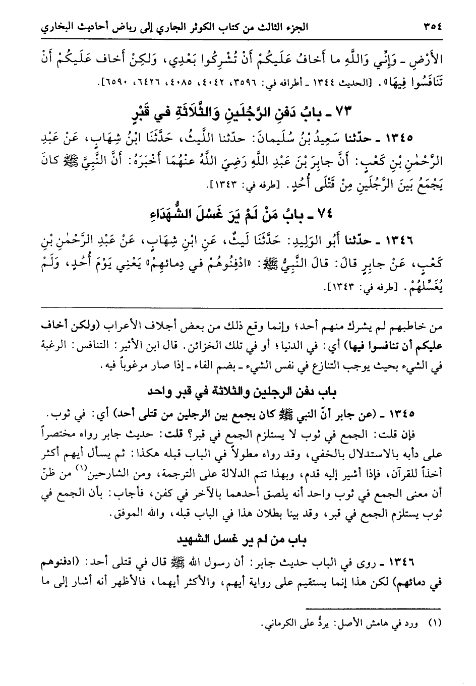 1345 - (عن جابر أن النبي - صلى الله عليه وسلم - كان يجمع بين الرجلين من قتلى أحد) أي: في ثوب. فإن قلت: الجمع في ثوب لا يستلزم الجمع في قبر؟ قلت: حديث جابر رواه مختصرًا على دأبه بالاستدلال بالخفي، وقد رواه مطولًا في الباب قبله هكذا: ثم يسأل أيهم أكثر أخذًا للقرآن، فإذا أشير إليه قدم، وبهذا تتم الدلالة على الترجمة، ومن الشارحين من ظنّ أن معنى الجمع في ثوب واحد أنه يلصق أحدهما بالآخر في كفن، فأجاب: بأن الجمع في ثوب يستلزم الجمع في قبر، وقد بينا بطلان هذا في الباب قبله، والله الموفق.