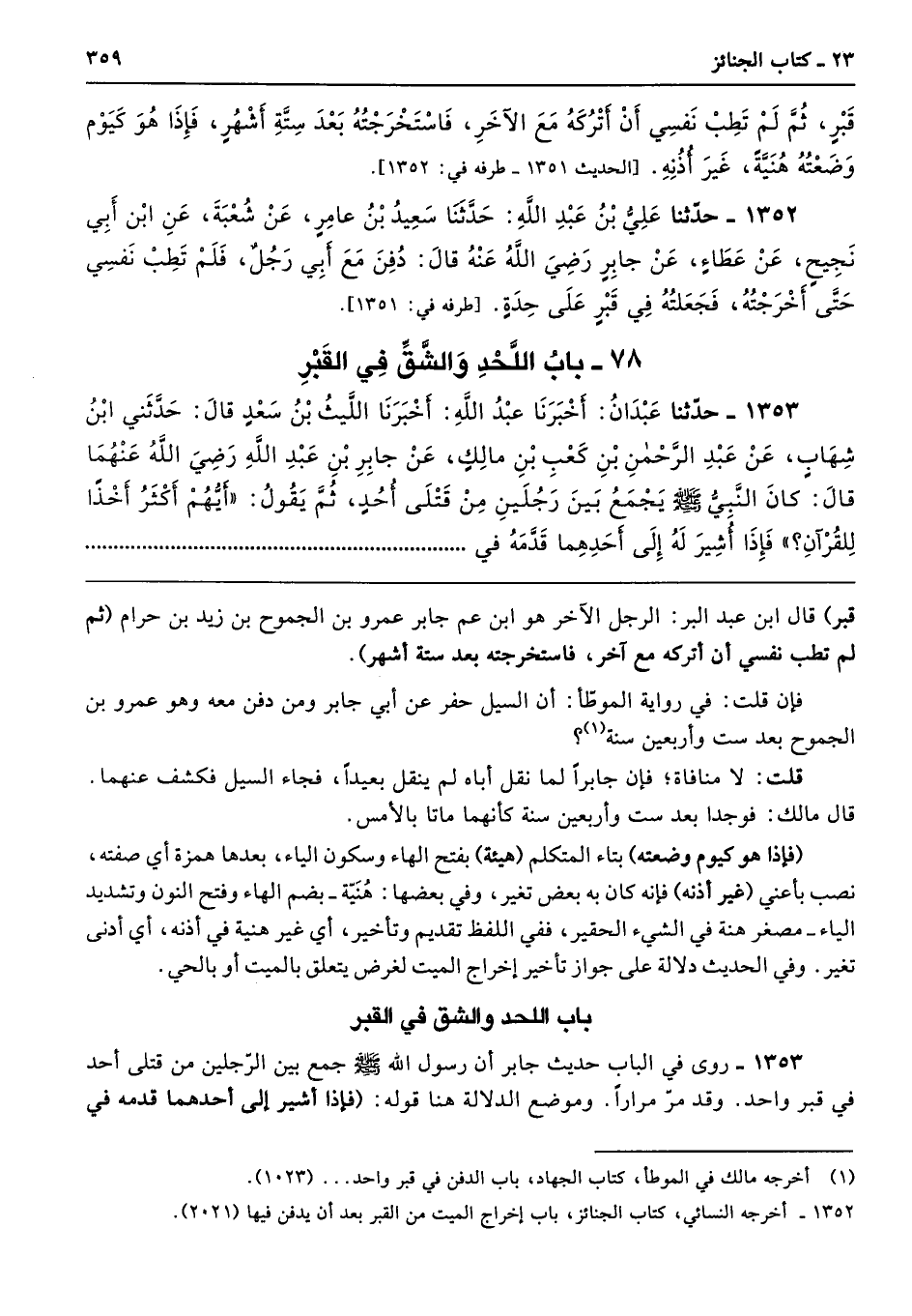 1353 - روى في الباب حديث جابر أن رسول الله - صلى الله عليه وسلم - جمع بين الرّجلين من قتلى أحد في قبر واحد. وقد من مرارًا. وموضع الدلالة هنا قوله: (فإذا أشير إلى أحدهما قدمه في