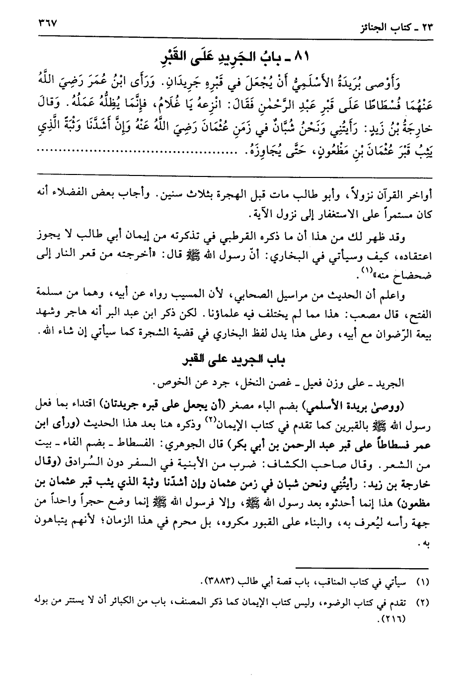 81 - باب الْجَرِيدِ عَلَى الْقَبْرِ. (81) وَأَوْصَى بُرَيْدَةُ الأَسْلَمِىُّ أَنْ يُجْعَلَ فِي قَبْرِهِ جَرِيدَانِ. وَرَأَى ابْنُ عُمَرَ - رضى الله عنهما - فُسْطَاطًا عَلَى قَبْرِ عَبْدِ الرَّحْمَنِ فَقَالَ انْزِعْهُ يَا غُلاَمُ، فَإِنَّمَا يُظِلُّهُ عَمَلُهُ.