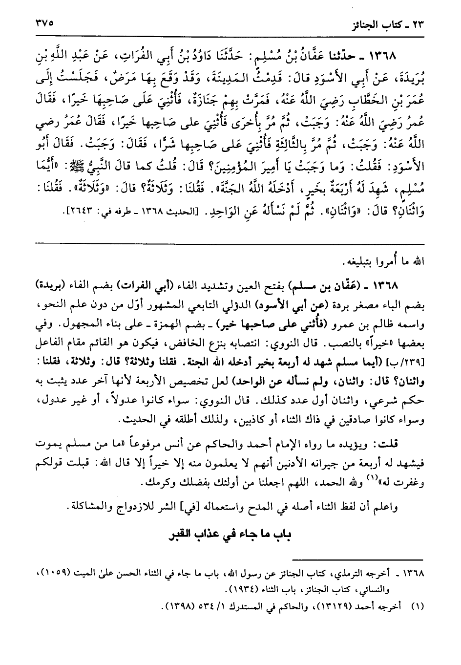 1368 - (عَفّان بن مسلم) بفتح العين وتشديد الفاء (أبي الفرات) بضم الفاء (بريدة) بضم الباء مصغر بردة (عن أبي الأسود) الدؤلي التابعي المشهور أوّل من دون علم النحو، واسمه ظالم بن عمرو (فأُثني على صاحبها خير) -بضم الهمزة- على بناء المجهول. وفي بعضها "خيرًا" بالنصب. قال النووي: انتصابه بنزع الخافض، فيكون هو القائم مقام الفاعل (أيما مسلم شهد له أربعة بخير أدخله الله الجنة. فقلنا وثلاثة؟ قال: وثلاثة، فقلنا: واثنان؟ قال: واثنان، ولم نسأله عن الواحد) لعل تخصيص الأربعة لأنها آخر عدد يثبت به حكم شرعي، واثنان أول عدد كذلك. قال النووي: سواء كانوا عدولًا، أو غير عدول، وسواء كانوا صادقين في ذاك الثناء أو كاذبين، ولذلك أطلقه في الحديث.