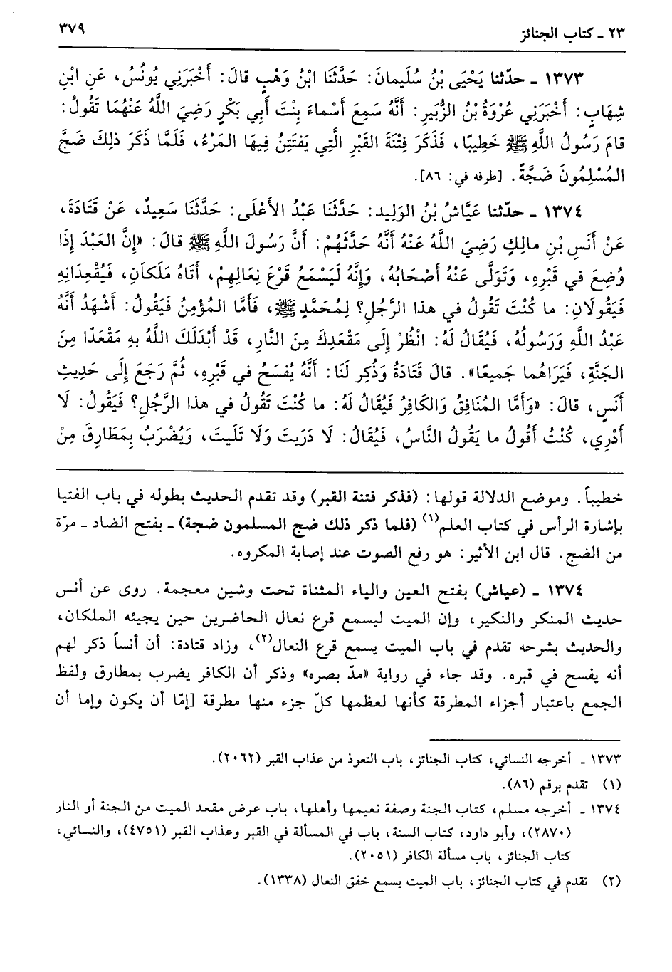 1374 - (عياش) بفتح العين والياء المثناة تحت وشين معجمة. روى عن أنس حديث المنكر والنكير، وإن الميت ليسمع قرع نعال الحاضرين حين يجيئه الملكان، والحديث بشرحه تقدم في باب الميت يسمع قرع النعال، وزاد قتادة: أن أنسًا ذكر لهم أنه يفسح في قبره. وقد جاء في رواية "مدّ بصره" وذكر أن الكافر يضرب بمطارق ولفظ الجمع باعتبار أجزاء المطرقة كأنها لعظمها كل جزء منها مطرقة [إمّا أن يكون وإما أن