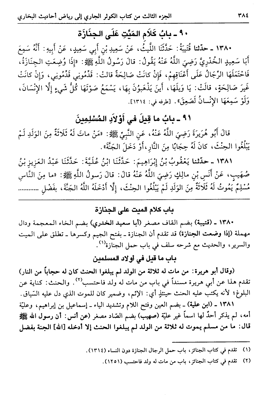 1381 - (ابن علية) -بضم العين وفتح اللام وتشديد الياء- إسماعيل بن إبراهيم، وعليّة أمه، لم يذكر أحدٌ لها اسمًا غير عليّة (صهيب) بضم الصّاد مصغر (عن أنس: أن رسول الله - صلى الله عليه وسلم - قال: ما من مسلم يموت له ثلاثة من الولد لم يبلغوا الحنث إلا أدخله [الله] الجنة بفضل