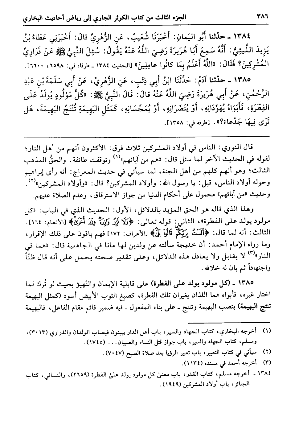 1385 - (كل مولود يولد على الفطرة) على قابلية الإيمان والتّهيؤ بحيث لو تُرك لما اختار غيره، فأبواه هما اللذان يغيران تلك الفطرة، كصبغ الثوب الأبيض أسود (كمثل البهيمة تنتج البهيمة) بنصب البهيمة وتنتج -على بناء المفعول- فيه ضمير قائم مقام الفاعل، فالبهيمة