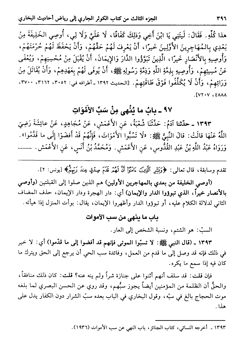 1393 - (قال النبي - صلى الله عليه وسلم -: لا تسبّوا الموتى فإنهم قد أفضوا إلى ما قدّموا) أي: لا خير في ذلك فإنه قد وصل إلى ما قدم من العمل، وفائدة سب الحي أن يرجع إلى الحق ويترك ما كان فيه إذا سمع ما يكره.