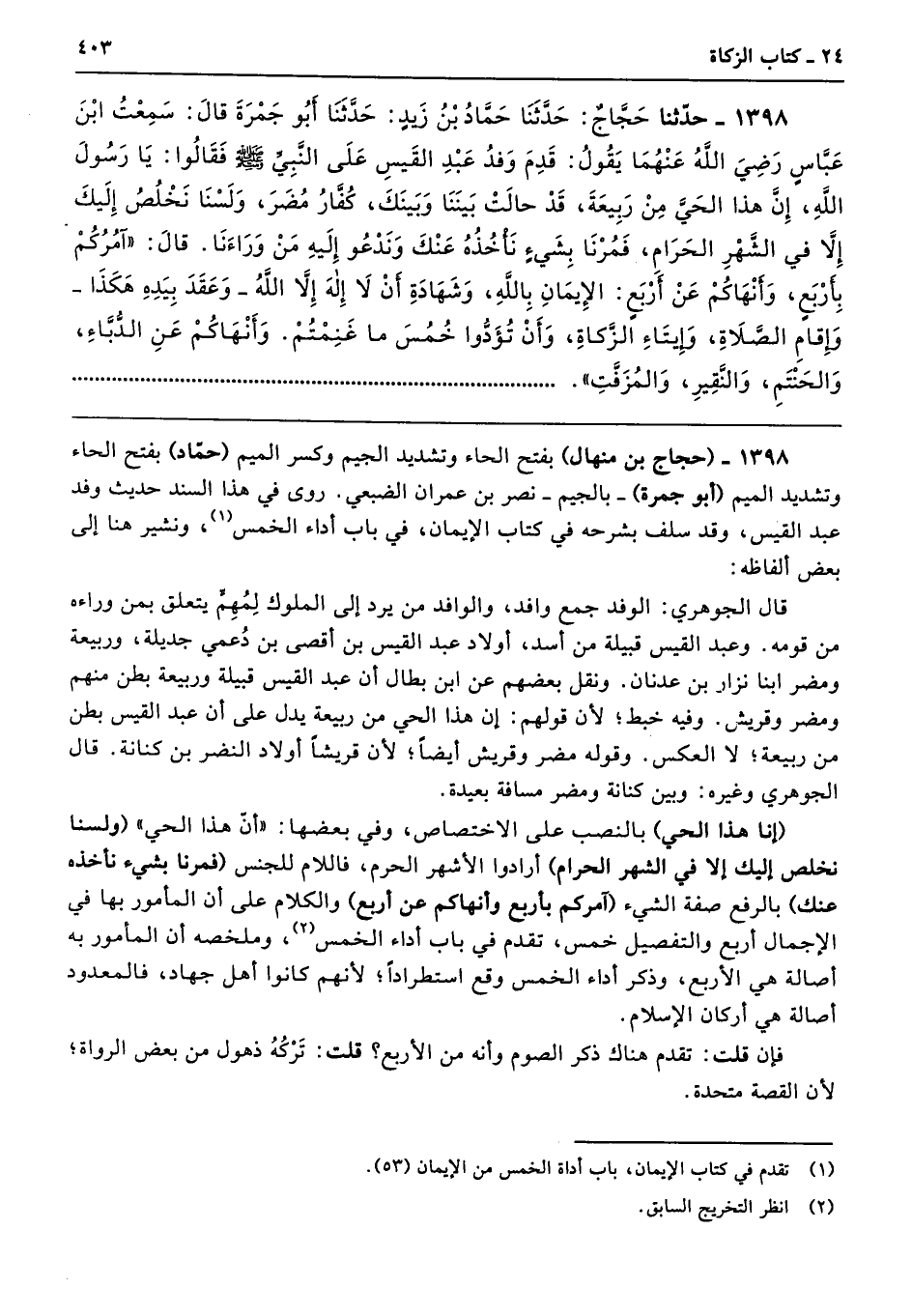 1398 - (حجاج بن منهال) بفتح الحاء وتشديد الجيم وكسر الميم (حمّاد) بفتح الحاء وتشديد الميم (أبو جمرة) -بالجيم- نصر بن عمران الضبعي. روى في هذا السند حديث وفد عبد القيس، وقد سلف بشرحه في كتاب الإيمان، في باب أداء الخمس، ونشير هنا إلى بعض ألفاظه: