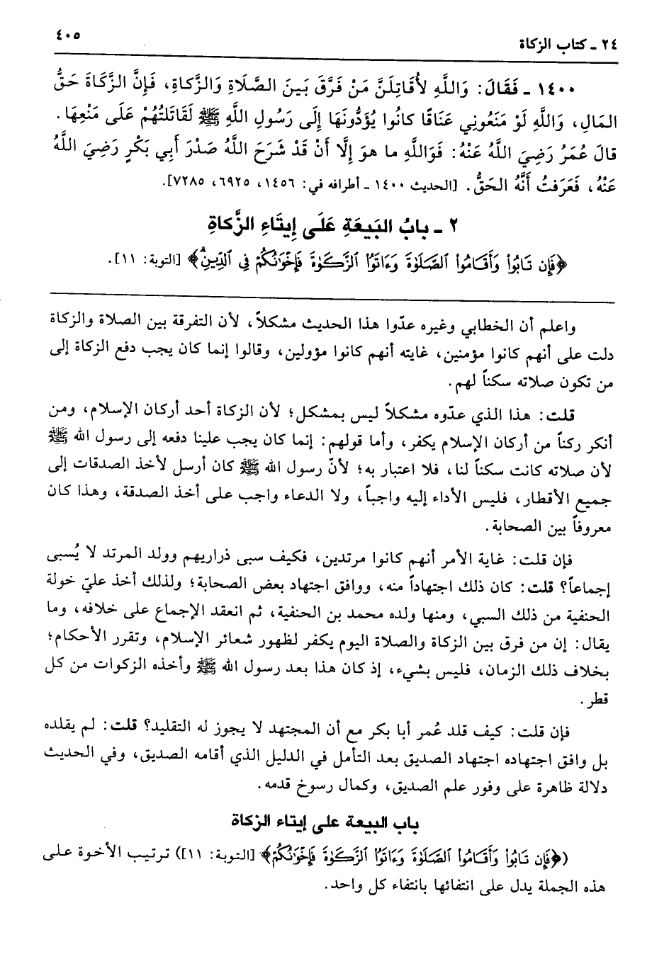 1400 - فَقَالَ وَاللَّهِ لأُقَاتِلَنَّ مَنْ فَرَّقَ بَيْنَ الصَّلاَةِ وَالزَّكَاةِ، فَإِنَّ الزَّكَاةَ حَقُّ الْمَالِ، وَاللَّهِ لَوْ مَنَعُونِى عَنَاقًا كَانُوا يُؤَدُّونَهَا إِلَى رَسُولِ اللَّهِ - صلى الله عليه وسلم - لَقَاتَلْتُهُمْ عَلَى مَنْعِهَا. قَالَ عُمَرُ - رضى الله عنه - فَوَاللَّهِ مَا هُوَ إِلاَّ أَنْ قَدْ شَرَحَ اللَّهُ صَدْرَ أَبِى بَكْرٍ - رضى الله عنه - فَعَرَفْتُ أَنَّهُ الْحَقُّ. أطرافه 1456، 6925، 7285